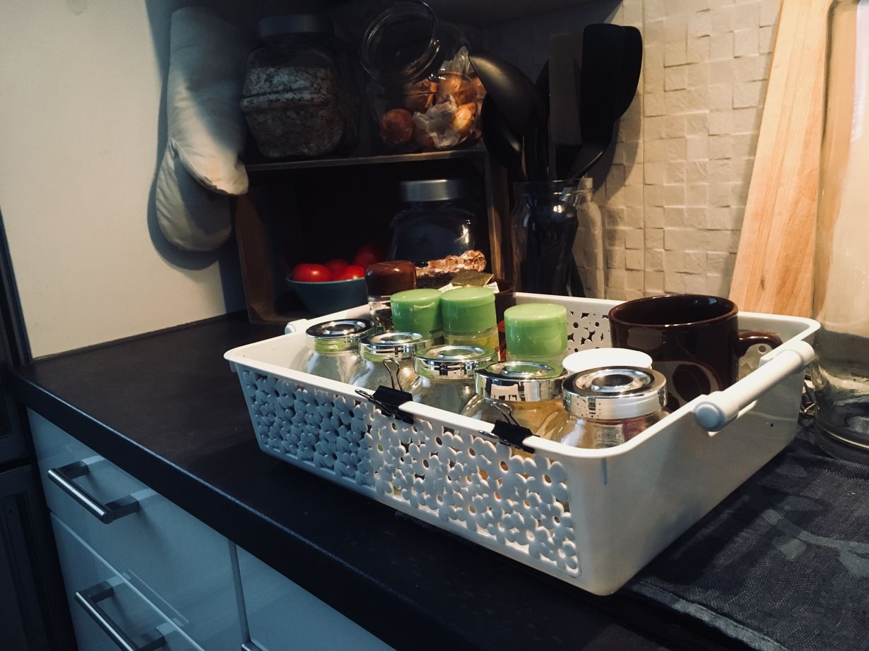 Meillä ei ole kotona varsinaista ”maustehyllyä” eikä mausteille varsinaista omaa paikkaa - joten, olemme kotona kehittäneet maustekorin. Mausteet ovat pienissä lasipurkeissa korissa, josta ne on helppo ottaa. Lihaliemikuutiot löytyvät ruskeasta vanhasta kahvikupista. Mitään aakkos- tai käyttöjärjestystä ei ole muuta kuin, ruoka- ja leivontamausteet ovat erillään.
