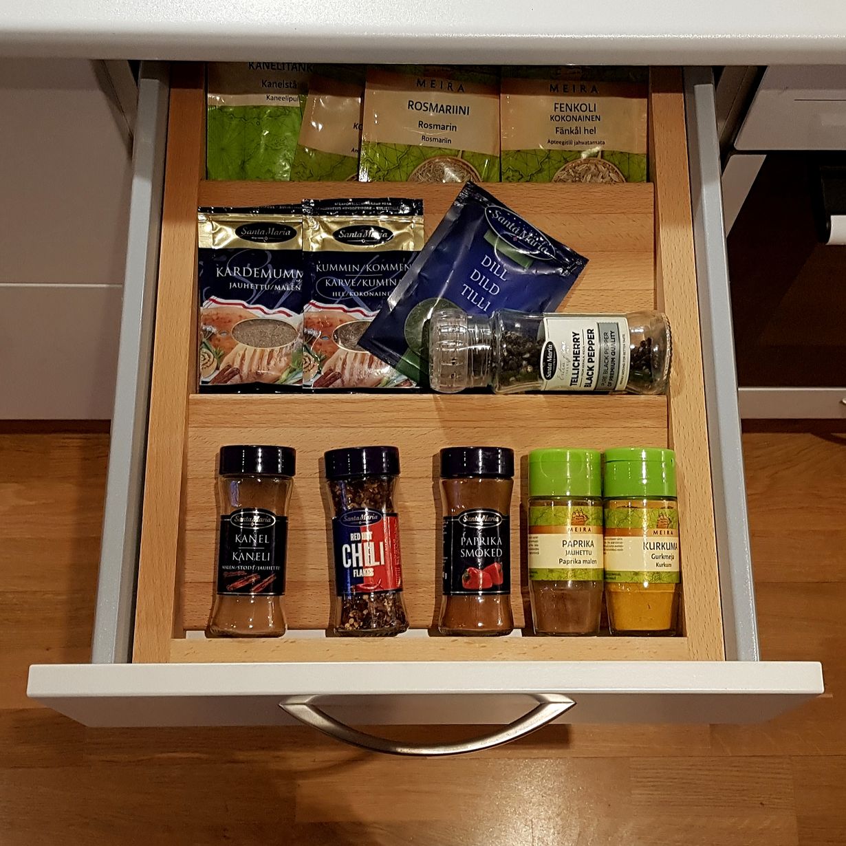 Meidän maustehylly on ylimmässä vetolaatikossa lieden vieressä.