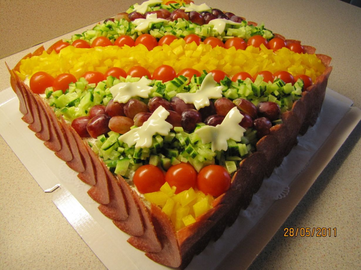 Mehevä ja maukas voileipäkakku kinkku-metvursti-täytteellä.