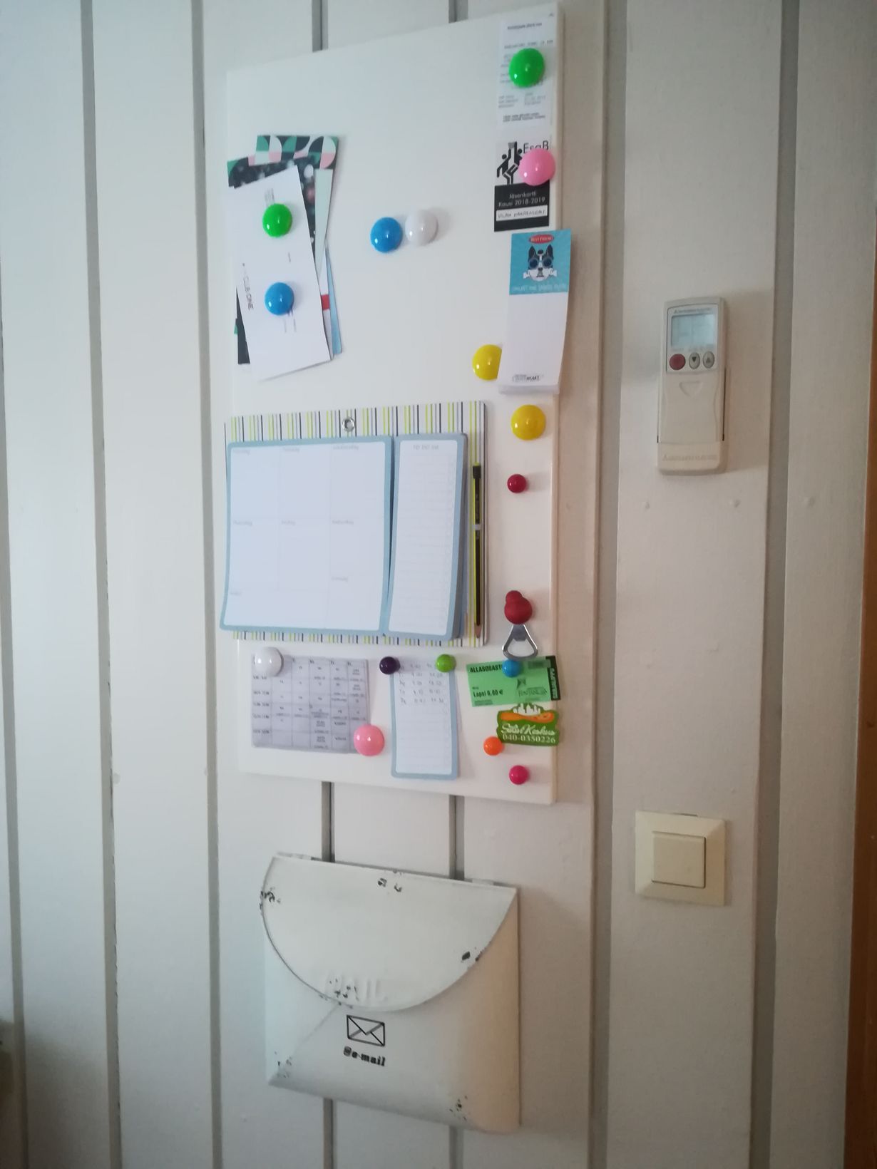 Seinämme on missä on Tärkeät muistamiset ja arjen ilmoitukset. Postilaatikkoon kerätään laskut maksupäivää odottaan.