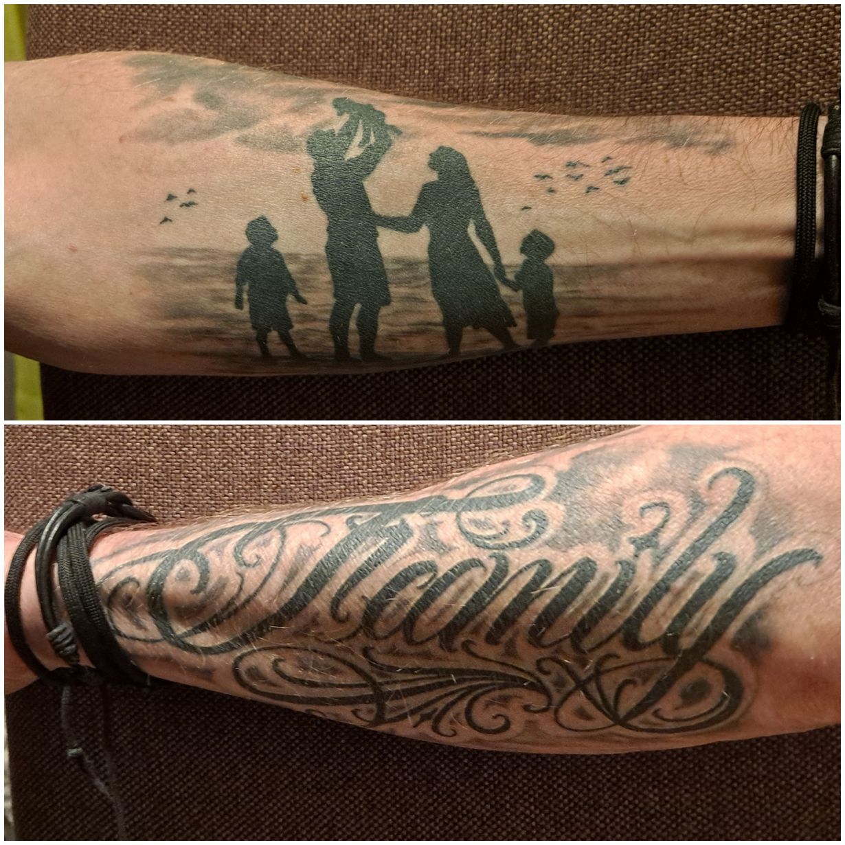 Päätimme nyt jo aikuisten lasten kanssa ostaa tatuointilahjakortin isälle, joka sitten halusi ottaa vanhaa valokuvaa mukaellen perhe-tatuoinnin.