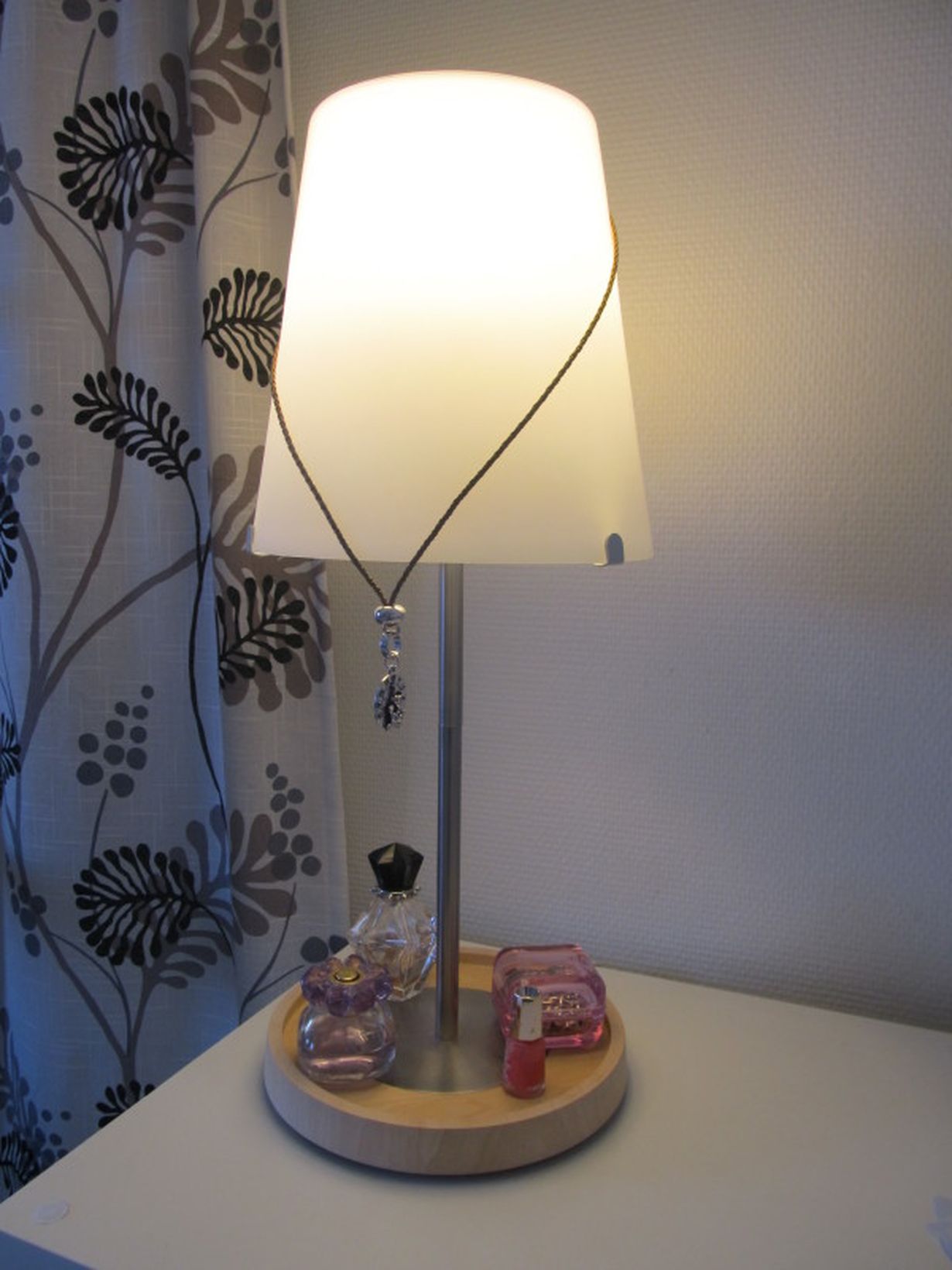 Ostin tämän lampun, sillä toinen kissani oli meikkipöydältä hypätessään polkaissut vanhan lasisen pallolamppuni seinään, jolloin se meni rikki. Ihastuin varsinkin lampun jalkaan, sillä siinä voi pitää esillä mm. kauniita hajuvesipulloja.