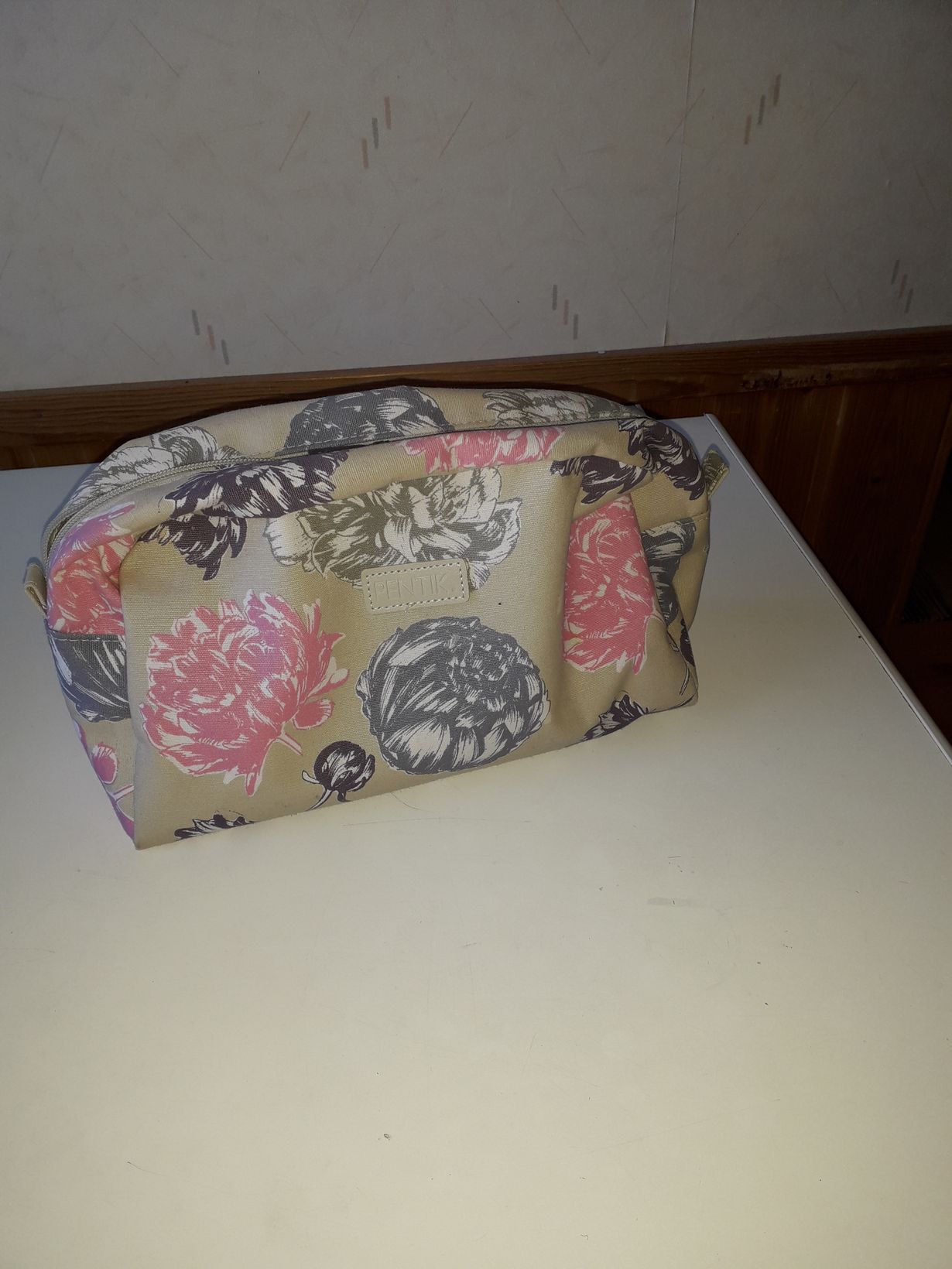 Sain työkavereilta lahjakortin Pentikin liikkeeseen jäädessäni eläkkeelle. Ostin tällaisen meikkipussin, jota minä käytän meikkipussina. En käytä meikkejä vaan rasvoja niidenkin edestä.