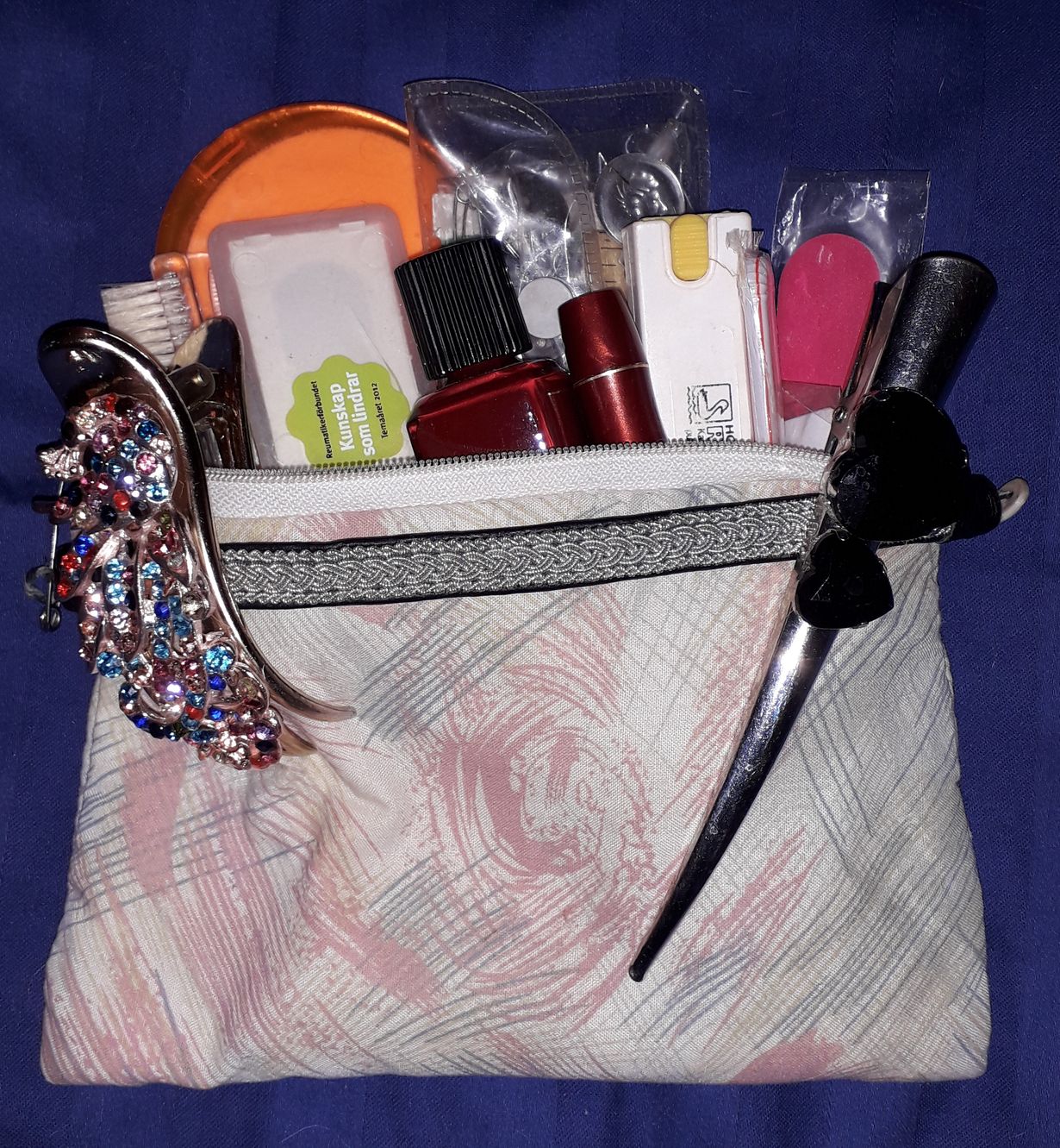 Sain pussukan joululahjaksi 30 vuotta sitten englantilaiselta ystävältäni. Se on sopivan pieni mutta ihmeen tilava. Laastarista tukkakampoihin ja ompelusettiin kulkee aina mukana.