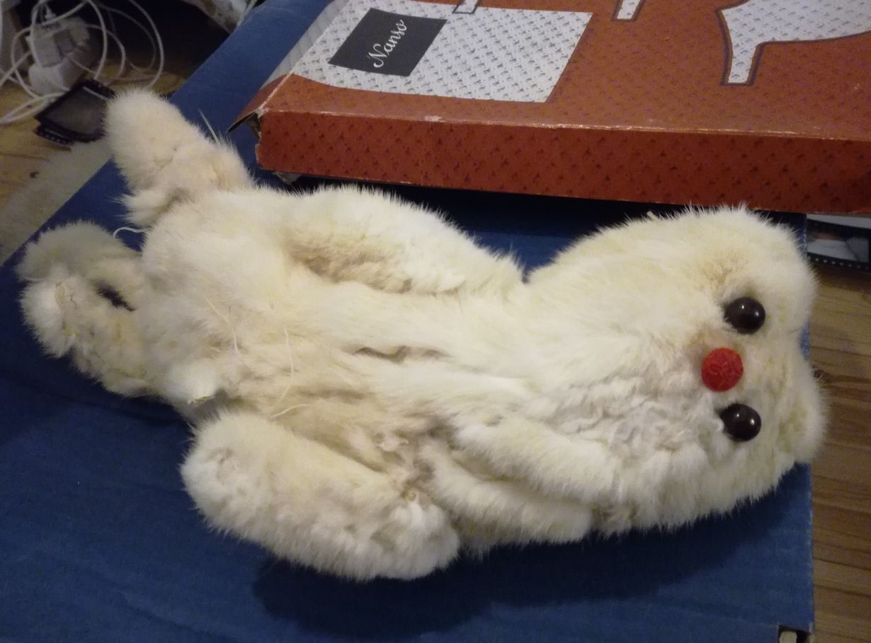 Äitini oli nuorena maalaistyttönä 1960-luvun alussa kotiapulaisena hienossa kauppiasperheessä. Rouvan uusiessa vaatevarastoaan oli äitini saanut häneltä valkoisen turkiskauluksen. Kun minä sitten synnyin 1969 ompeli äitini tuosta kauluksesta minulle kissan. Kissa on reissussa rähjääntynyt, mutta rakas ja tallessa edelleen.