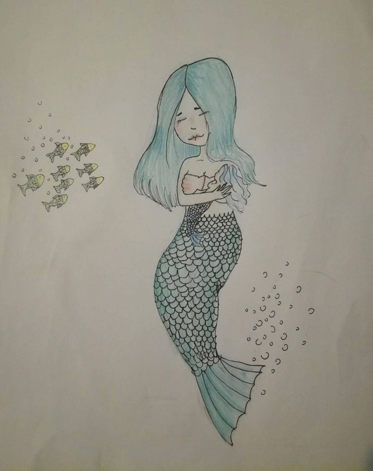 Merenneitoäiti tuudittelee vastasyntynyttä merenneitovauvaa. Kalaparvi on tullut ihailemaan uutta tulokasta meren valtakunnassa.