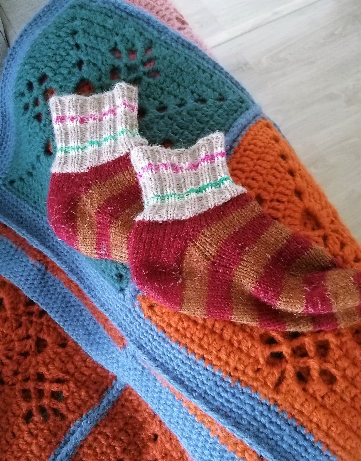 Oheiset merinovillasukat on tehty jämälangoista, joita jää aina välillä sukkaprojekteista jäljelle. Hyvin on toimineet, ovat lämpimät - ja mulla aina jalassa :) Kun noista aika jättää, niin teen varmaan toiset vastaavat jämälangoista tilalle.