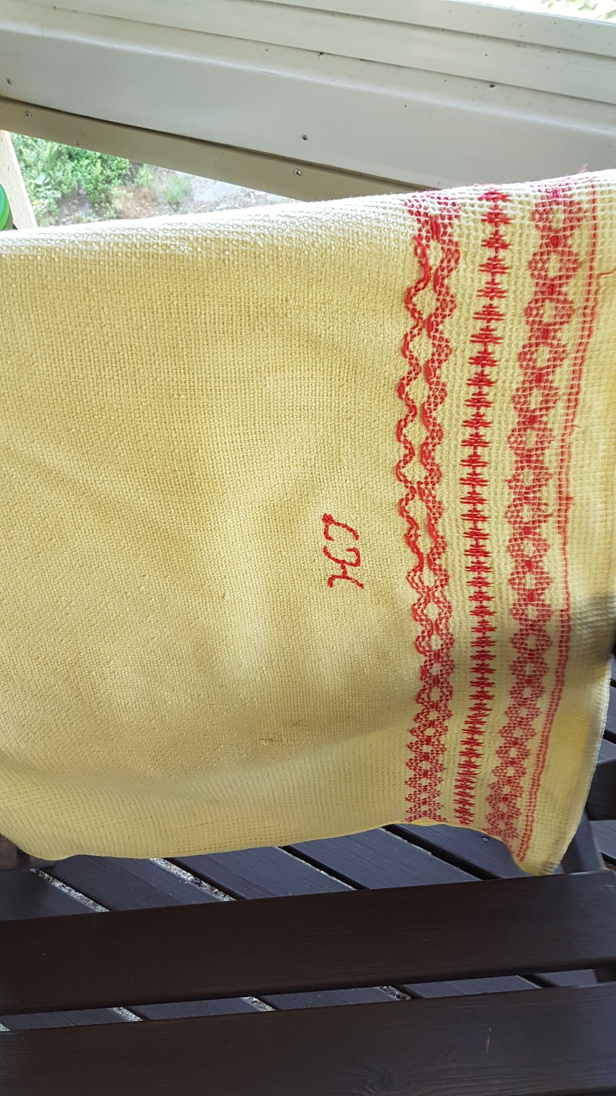 Yli 60 vuotta sitten koulussa tein tämän vohvelikankaisen pyyhkeen, johon merkkasin mol. päihin kuviot.