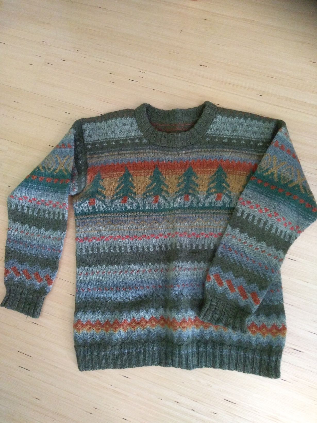 Hyvän ystäväni ja ahkeran kutojan mielestä mun piti saada metsäpaita, koska partiotaitokisoissa yhteisen kisavartiomme nimi oli aina Outa ja olen "metsämies". Paita on lämmittänyt 80-luvulta lähtien viileinä mökkipäivinä. Maija-ystävä nukkui pois tai partiolaisen sanoin meni kotiin viime elokuussa. Nyt paita on entistäkin arvokkaampi.