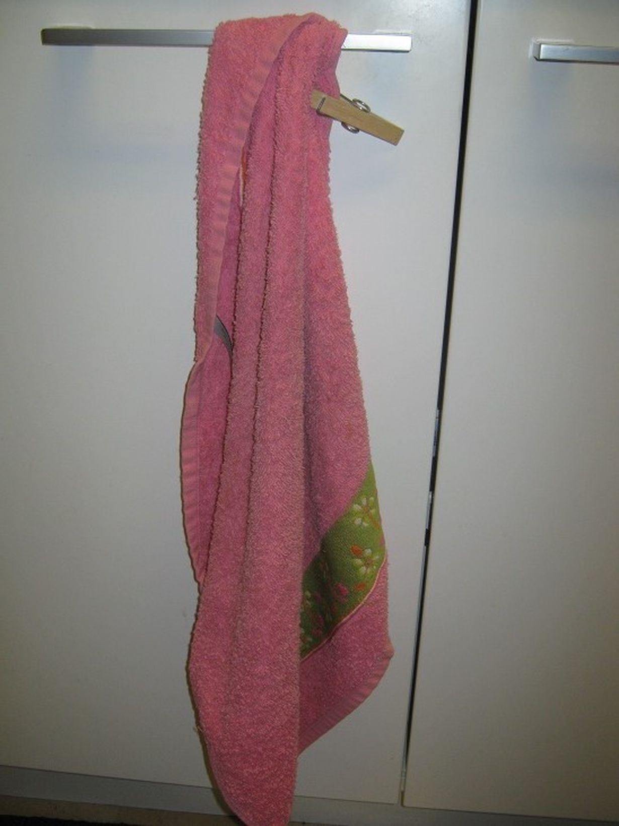Keittiöpyyhkeen sain lahjaksi kun muutin omaan kotiin. Miehelle näin pinkkiä. Pyykkipoika kaverina pitämään sen ovessa kiinni.