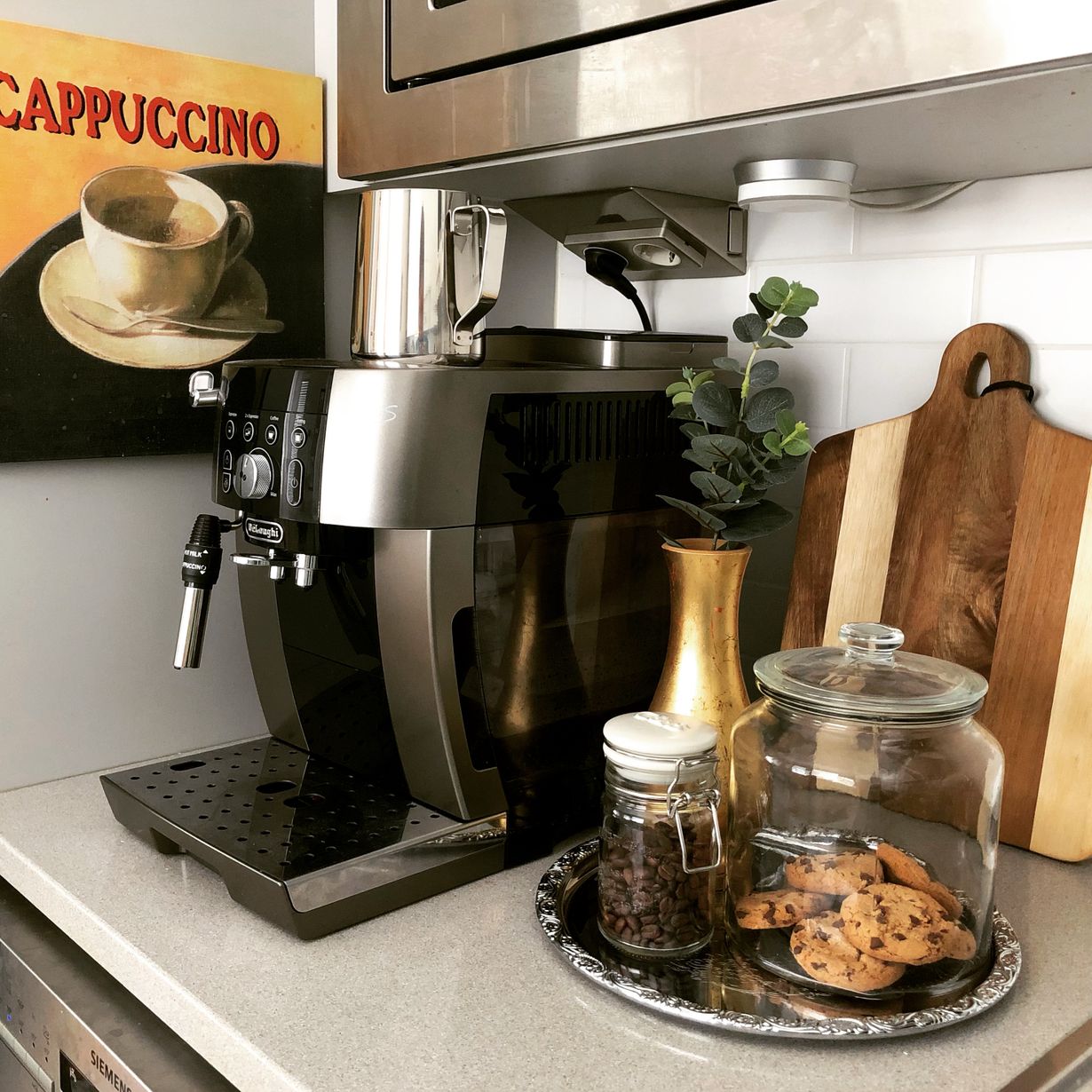 Mieheni pyysi joululahjaksi kahvikoneen, ja epäilin hankintaa tovin. Toteutin kuitenkin toiveen, ja nyt meillä on kaunis kahvinurkkaus sekä joka aamu kahvia vastajauhetuista pavuista.