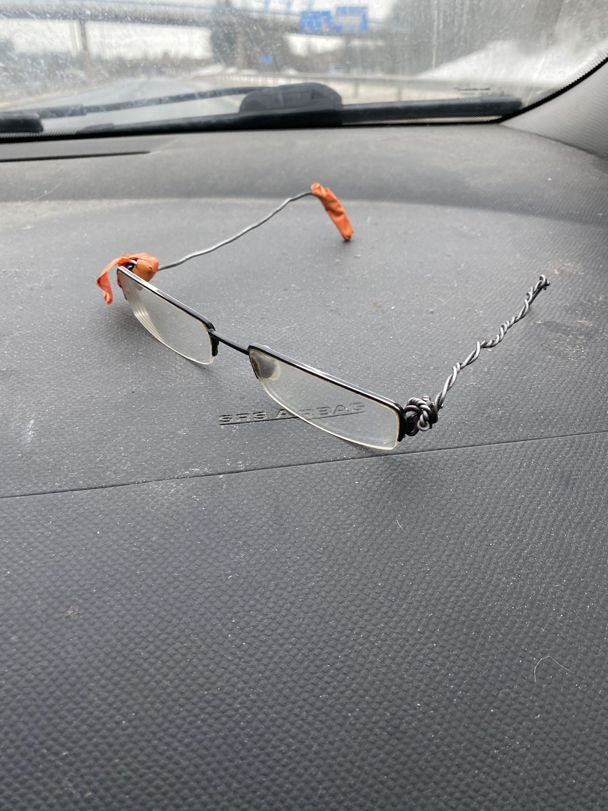 Mies ei vaan ehdi optikolle. molemmat sangat irronneet näistä 10 v vanhoista laseista ja toinen nenätamppi. Korjasin rujosti rautalangalla ja teipillä, jotta sais nopeemmin silmälasikaupoille. Ei auttanut.
