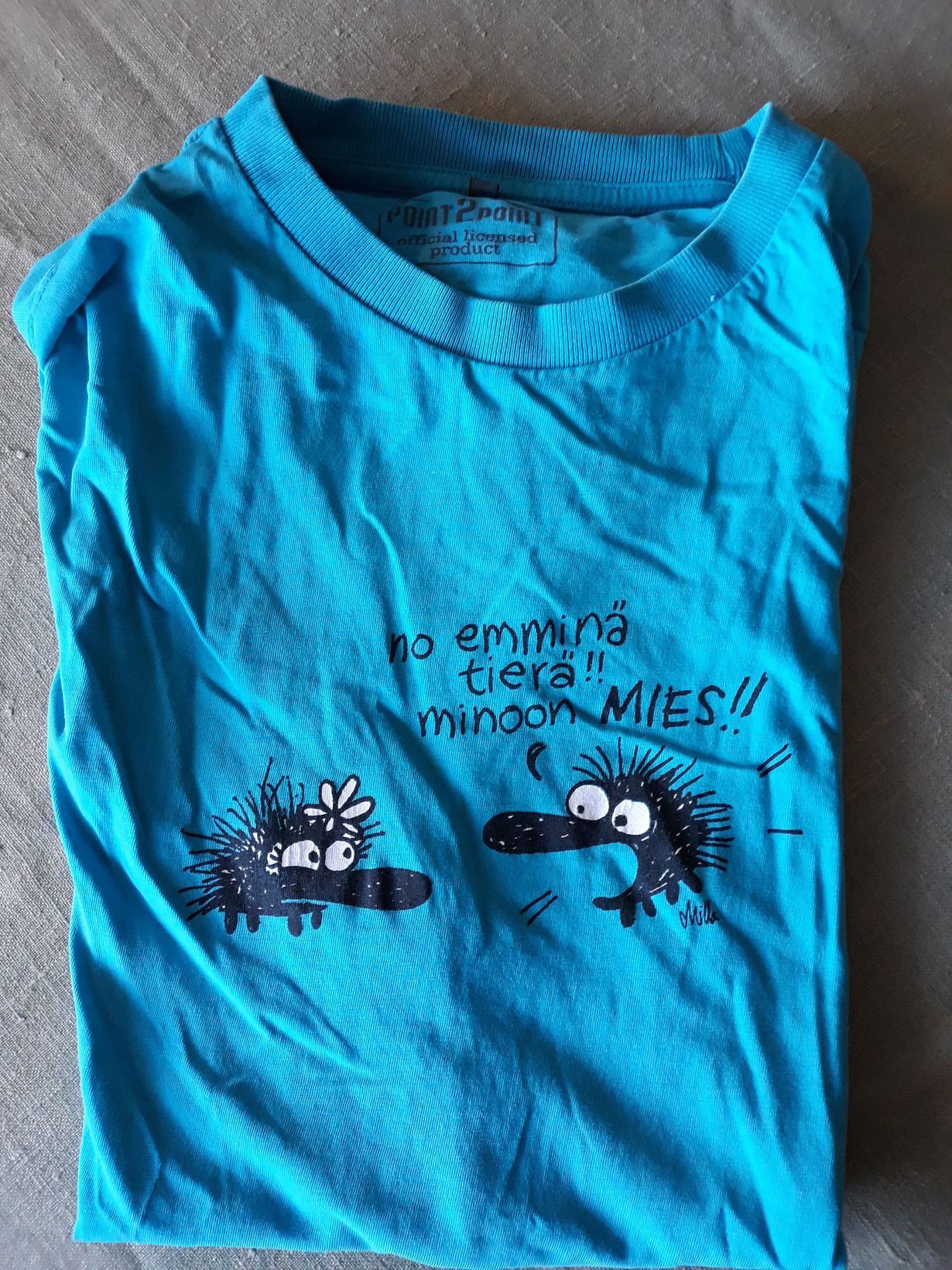 Vuosia sitten ostin piruillessani miehelleni tämän kiroileva siili -paidan. Yllättäen siitä tuli hänen lempipaitansa, joka on jo reikiintynytkin. Monet hymyt kirvoittanut vastaantulijoissa.
