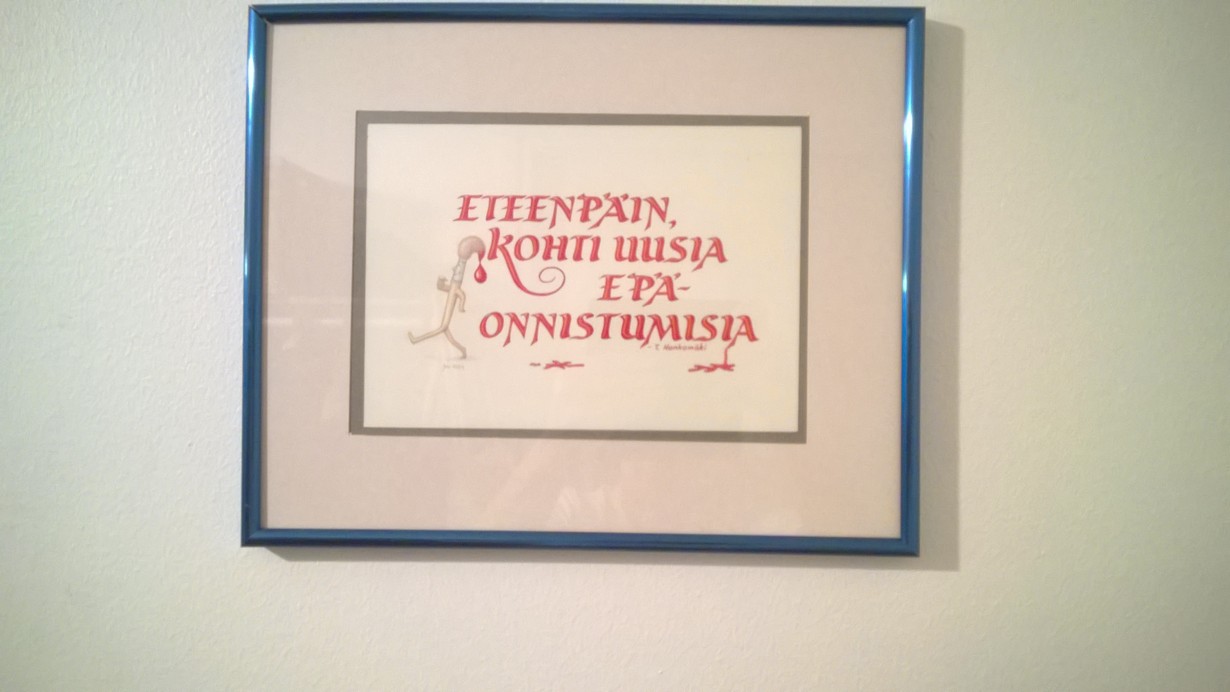 Tämä mieheni tekstaama mietelausetaulu kannustaa meitä eteisessä ulos mennessämme, varsinkin kun vielä kävimne töissä.