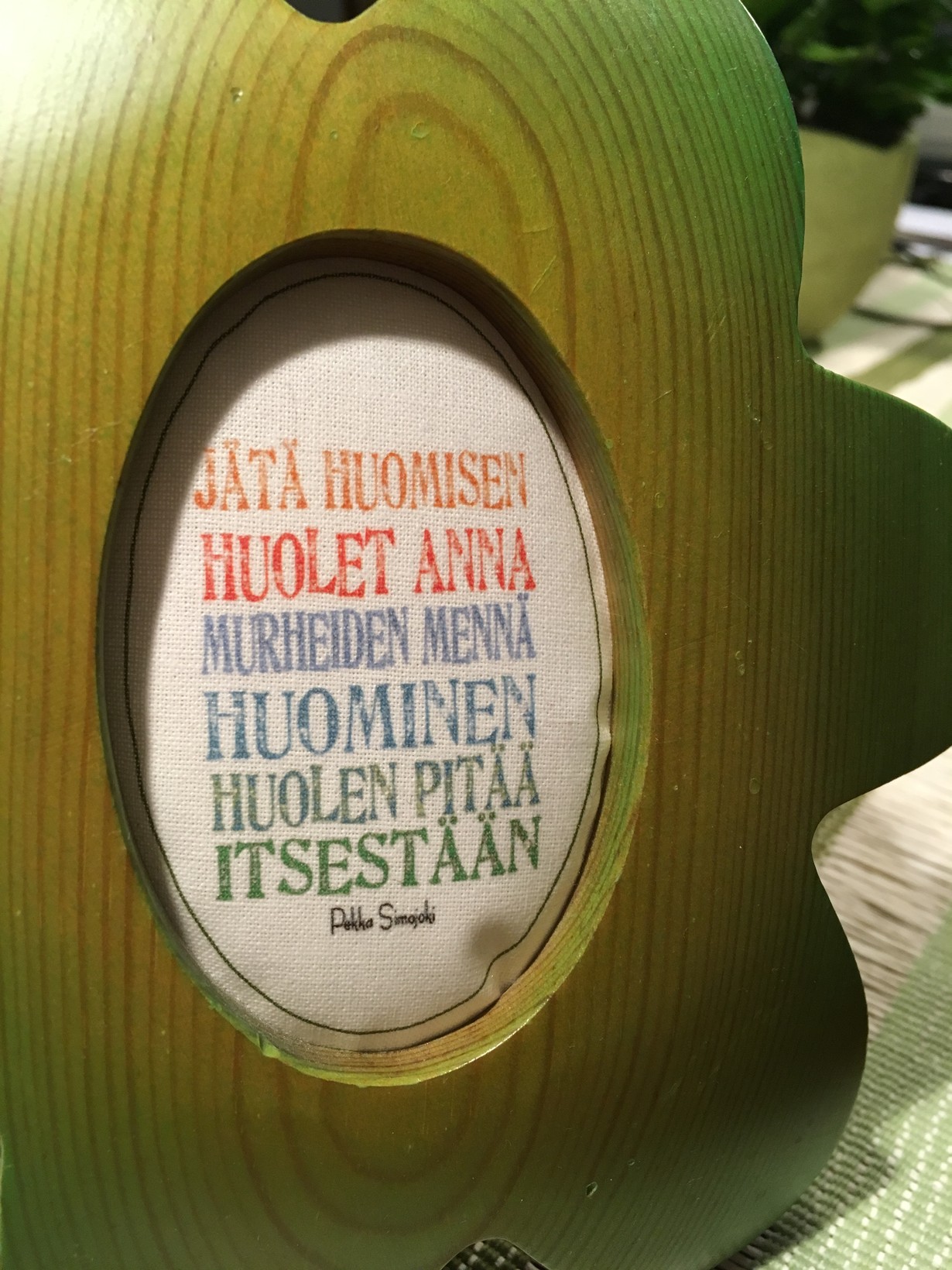 Olen ikuinen murehtija, tämä Simojoen Pekan teksti ihanasti rohkaisee. Ostin nämä kehykset tällä tekstillä EtCeteran konsertista.