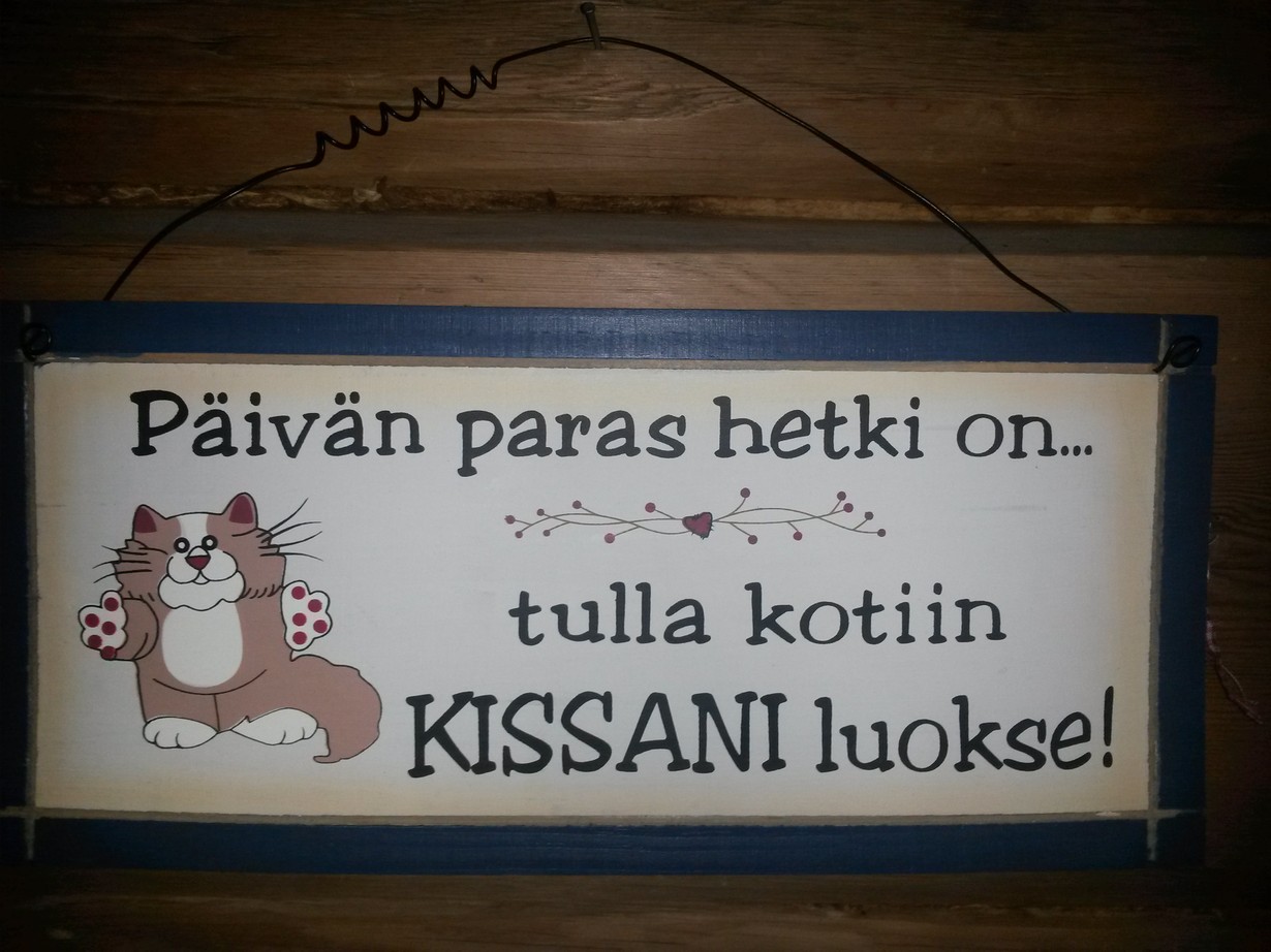 Meille tuli pihapiiriin seitsemän vuotta sitten ihan omatoimisesti kissa, joka päätti muuttaa lopullisesti meille. Se on meille tosi rakas, ja siksi tuo miete pitää niin paikkansa! Taulu on lahja naapurilta.