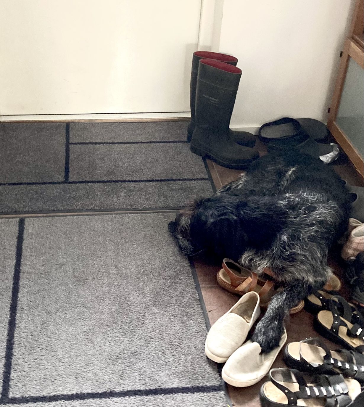 2. Vuotias saksanseisojamme Arttu on löytänyt suosikki paikkansa päiväunille ulko-oven viereltä kenkäkasan päällä. Syy tälle saattaa olla hänen tätinsä matriarkka Tellu 9v joka pitää sohvalla hoviaan.