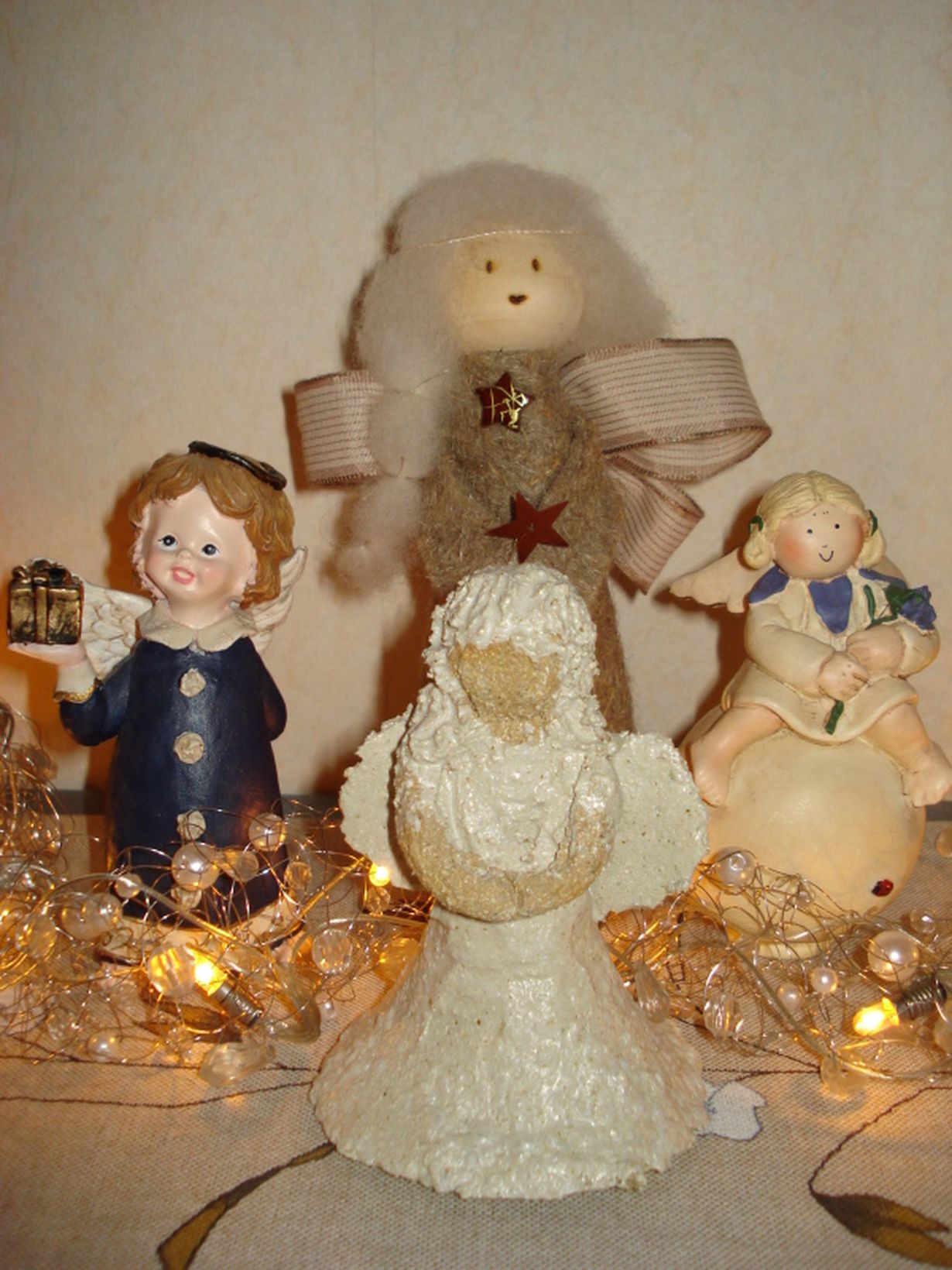 307:n enkelin kuorostani pääsee aina muutamia esille lipaston päälle vaihtuviin asetelmiin. Olipa vaikea valita vain yhtä enkeliä tähän kuvaan, joten päädyin näihin neljään. Yhden enkelin olen tehnyt itse, yhden saanut lahjaksi ja kaksi on löytynyt joulumyyjäisitä.