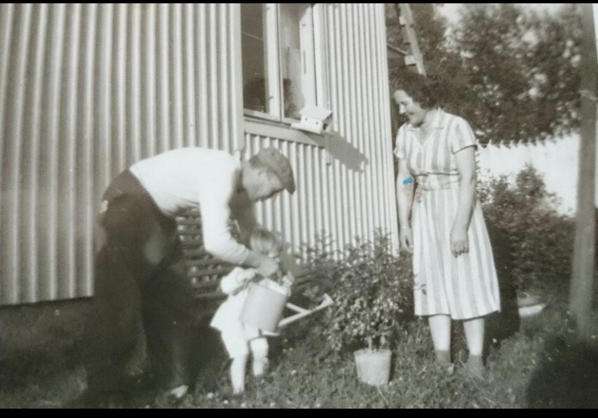 Minä ja isovanhempani kastelemassa kukkaa v.62. Olin hoidossa isovanhempieni luona, kun äitini oli sairaalassa pikkuveljeäni synnyttämässä.