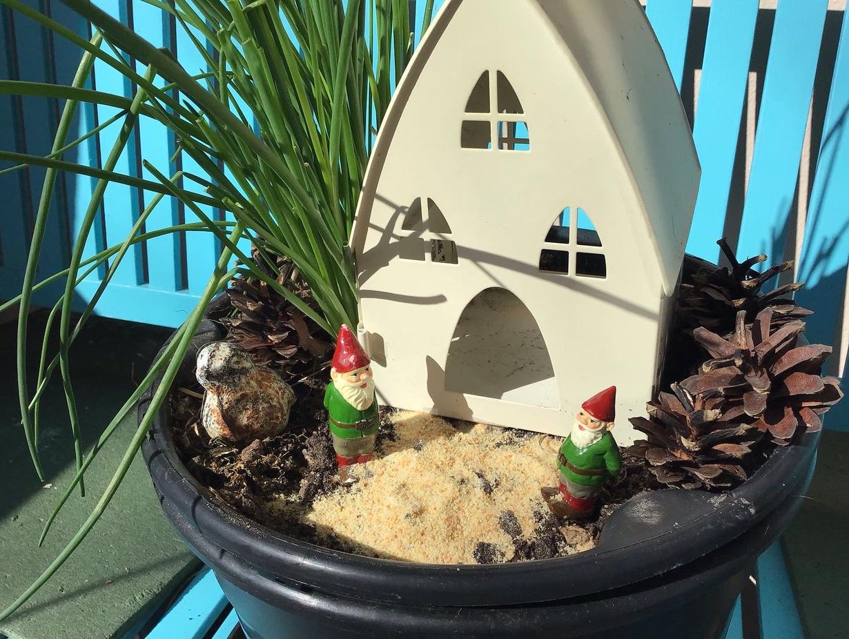 Koska minulla ei ole puutarhaa, laitoin tädiltä saamani tonttuveitsen ja -lusikan nyt keväällä parvekkeella kasvavan ruohosipulin ja talvesta parvekkeelle jääneen kynttilälyhdyn viereen multaan seisomaan. Pihan hiekka on korppujauhoa. Piakkoin varmaan pihalla askeltaa pieniä tipuja, pääsiäisen kunniaksi…ja pajunkissa mahdollisesti myös ilmestyy virpomiskoristeineen talon lähistölle.