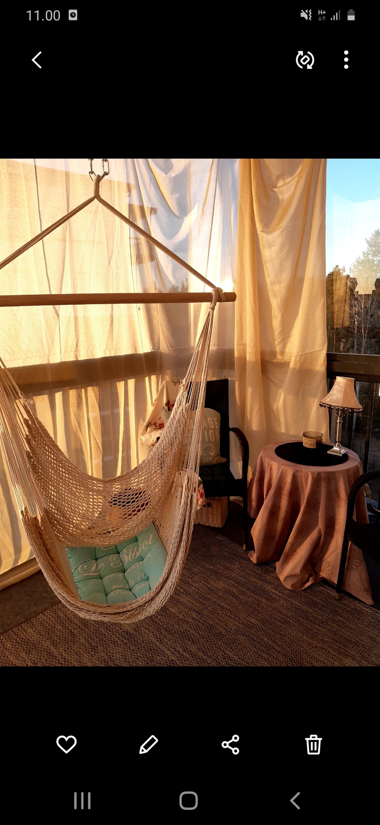 Oikeastaan se on riipputuoli mutta koska minulla ei ole enää pihaa niin tämä mahtuu paremmin parvekkeelle. Tässä on ihana kiikkua ja laittaa itsensä "perhostoukka-asentoon" pitkin pituuttaan miettimään syntyjä syviä.