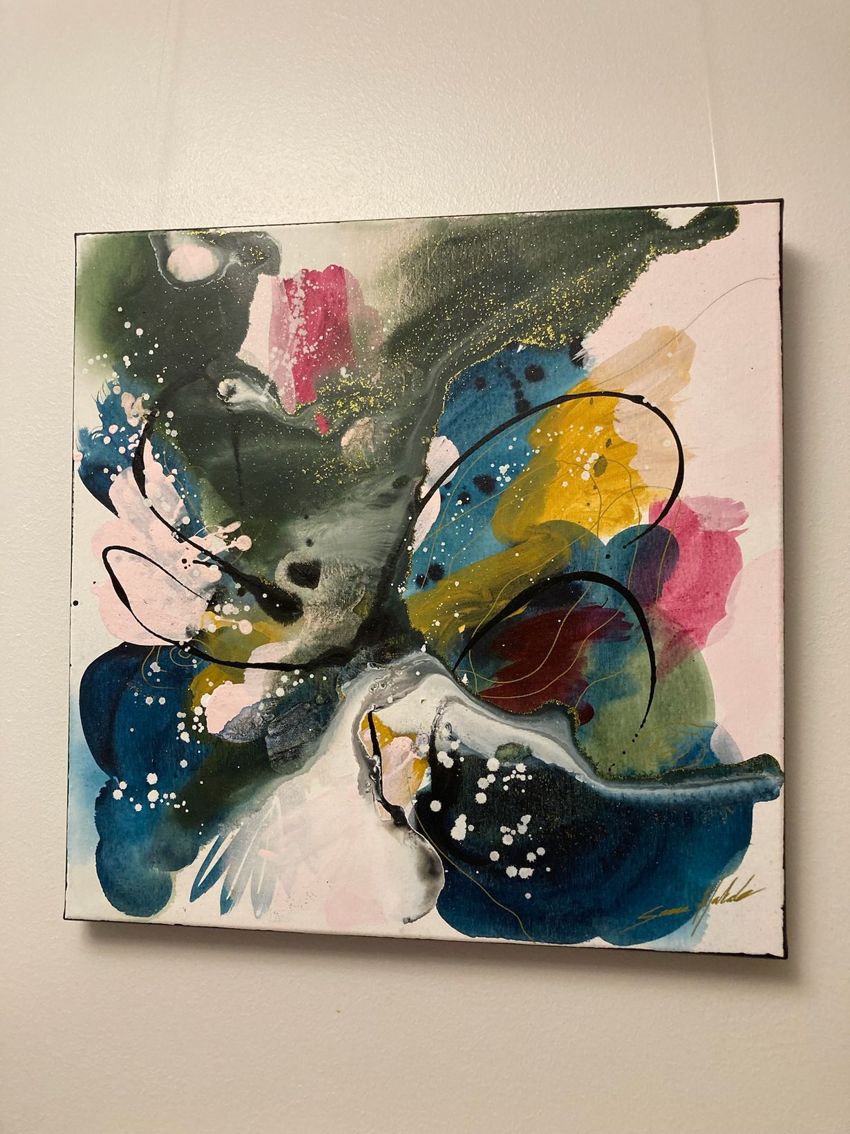 Syntymäpäivälahjaksi sain rakkailta lapsiltani ja lapsenlapsiltani tämän ihanan taulun, jonka nuori taiteilija Saana Hakala oli maalannut läheisteni antamien minua kuvailevien kauniiden sanojen perusteella. Aina sydämessä läikähtää kun katse osuu tauluun.