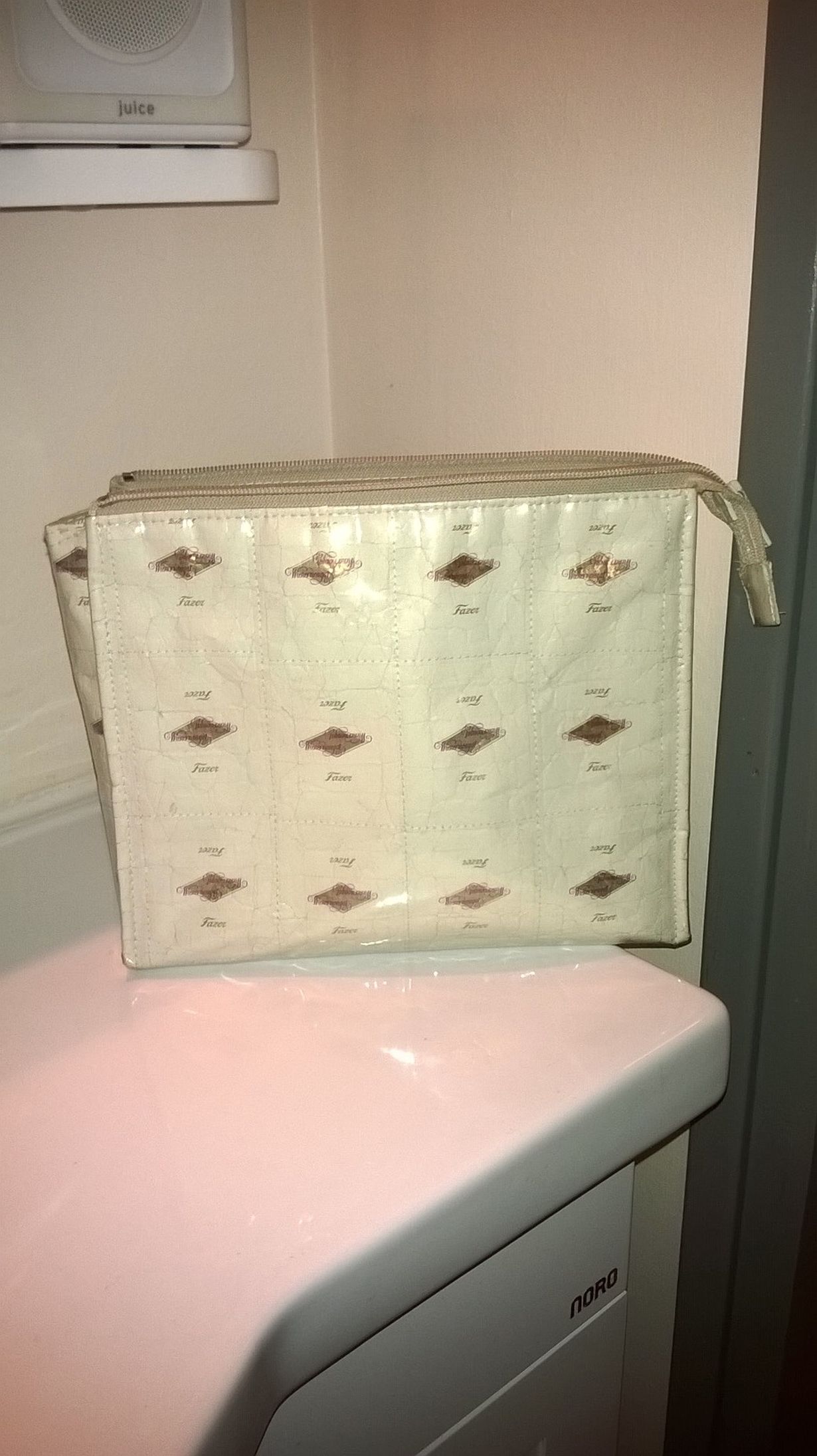 Tämä meikkipussi on ommeltu karamellipapereista. Ohuesta käärepaperista huolimatta se on erittäin kestävä, sillä vuoriosa on käytöstä jo poistettua suihkuverhoa ja päälle ommeltu kestävä läpinäkyvä muovi. Tämän meikkipussin on valmistanut siskoni ystävätär.