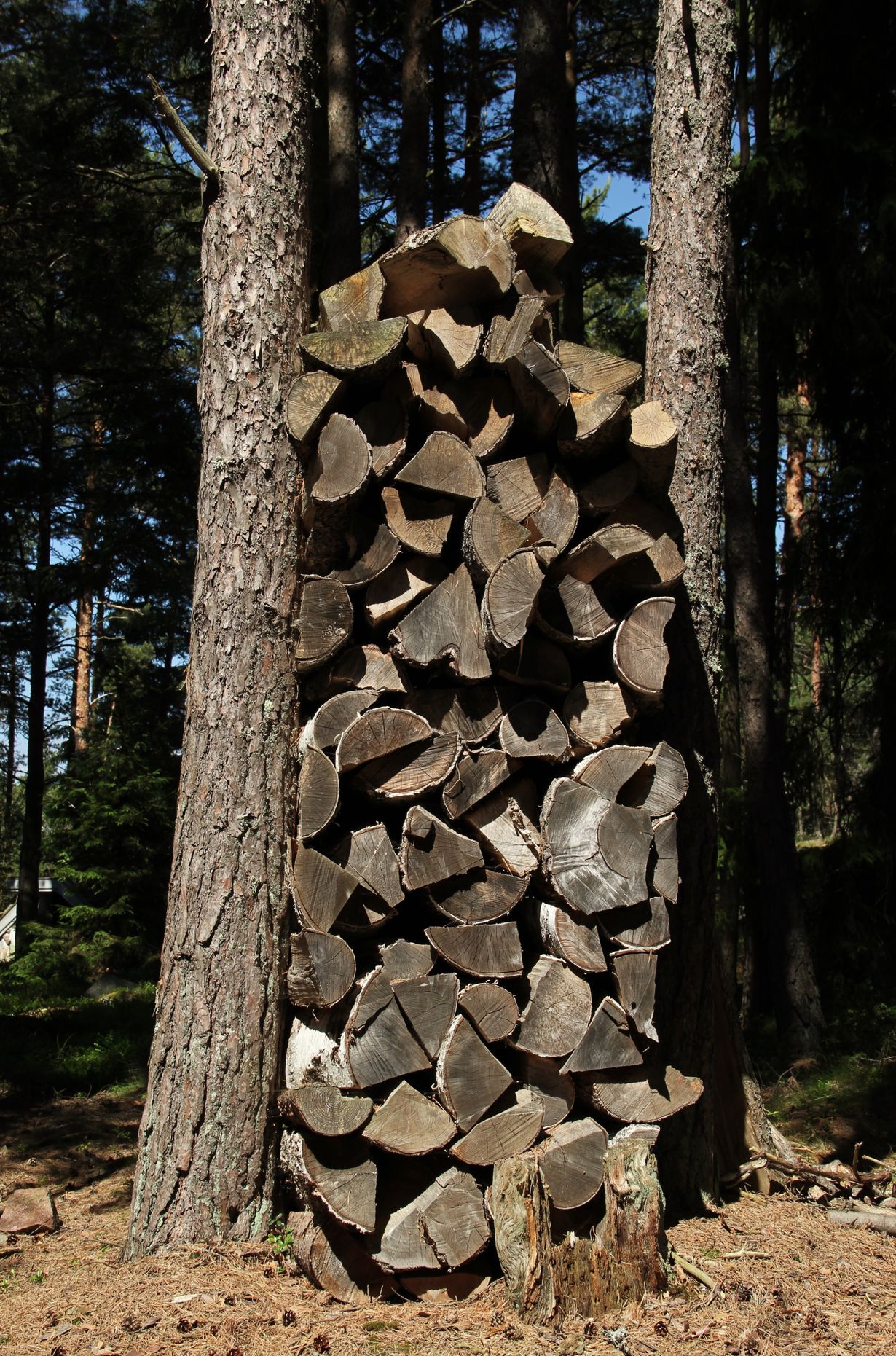 Halkoja on kerätty kahden korkean männyn väliin ja siinä halot pysyvät ja kestävät kovemmatkin myrskyt!
