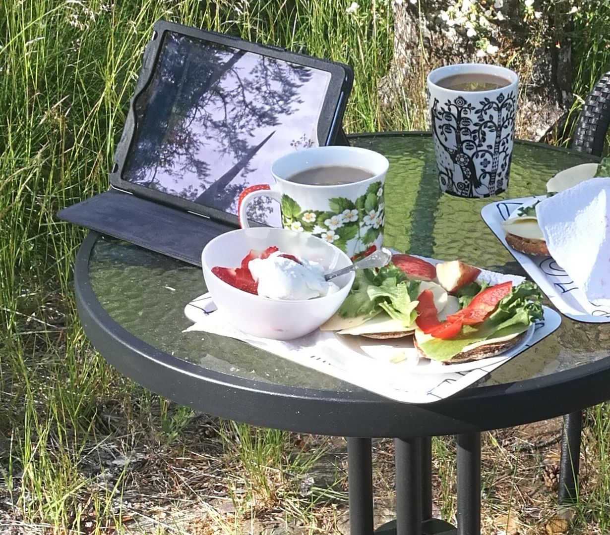 Eilamarin gluteeniton Hertta -hapanreissari, juustoa, salaattia, paprikaa ja omenaa. Maitokahvi tummajauhatus. Mansikoita ja jugurttia vaniljarahkalla maustettuna. Linnunlaulua ja laineiden liplatusta. Päivän lehti sähköisenä.