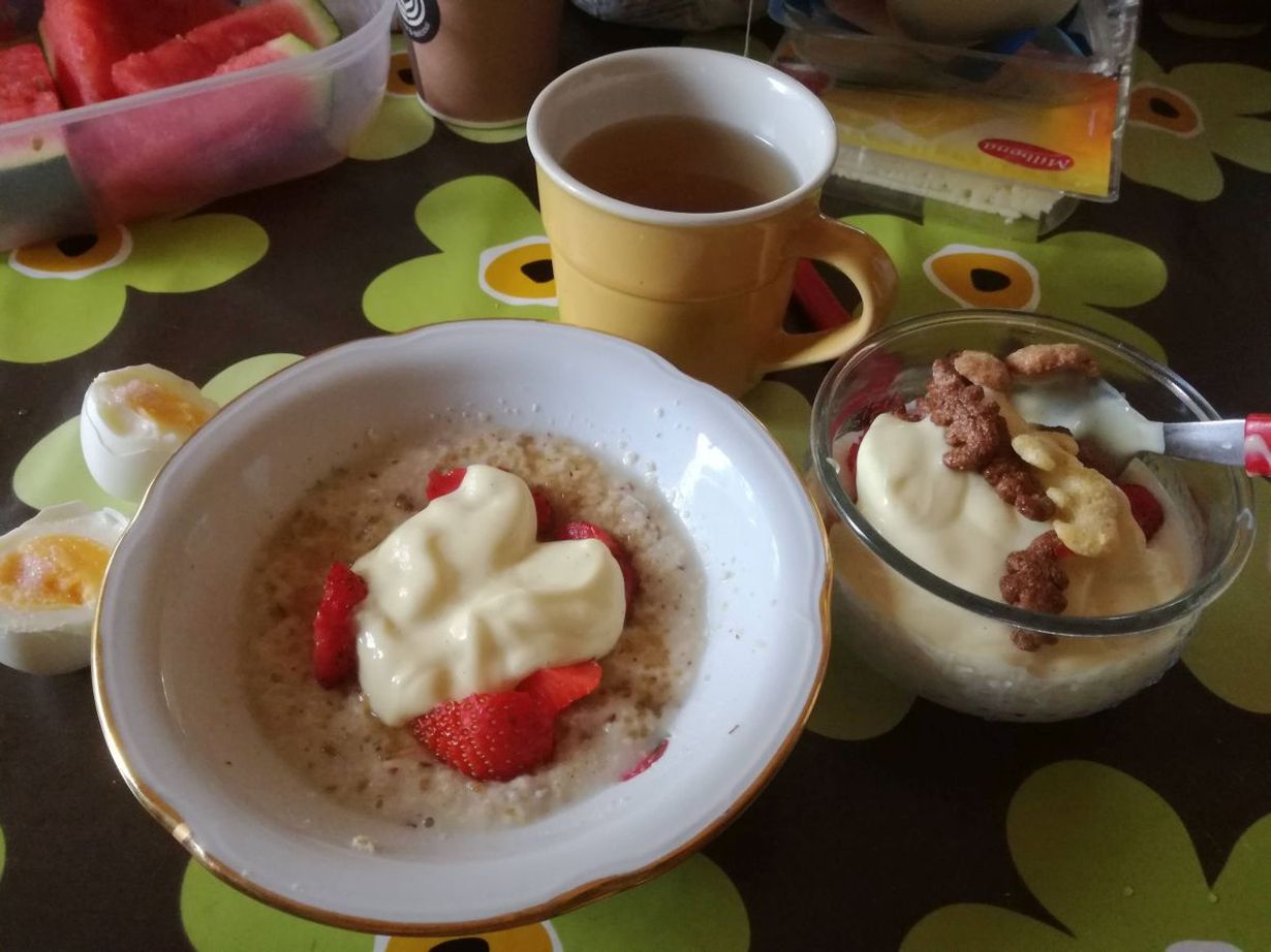 Mökillä puuro syödään kultareunaiselta lautaselta ja rahka vanhasta lasikupista. Aamiainen nautitaan hyvin nukutun yön jälkeen. Aah.