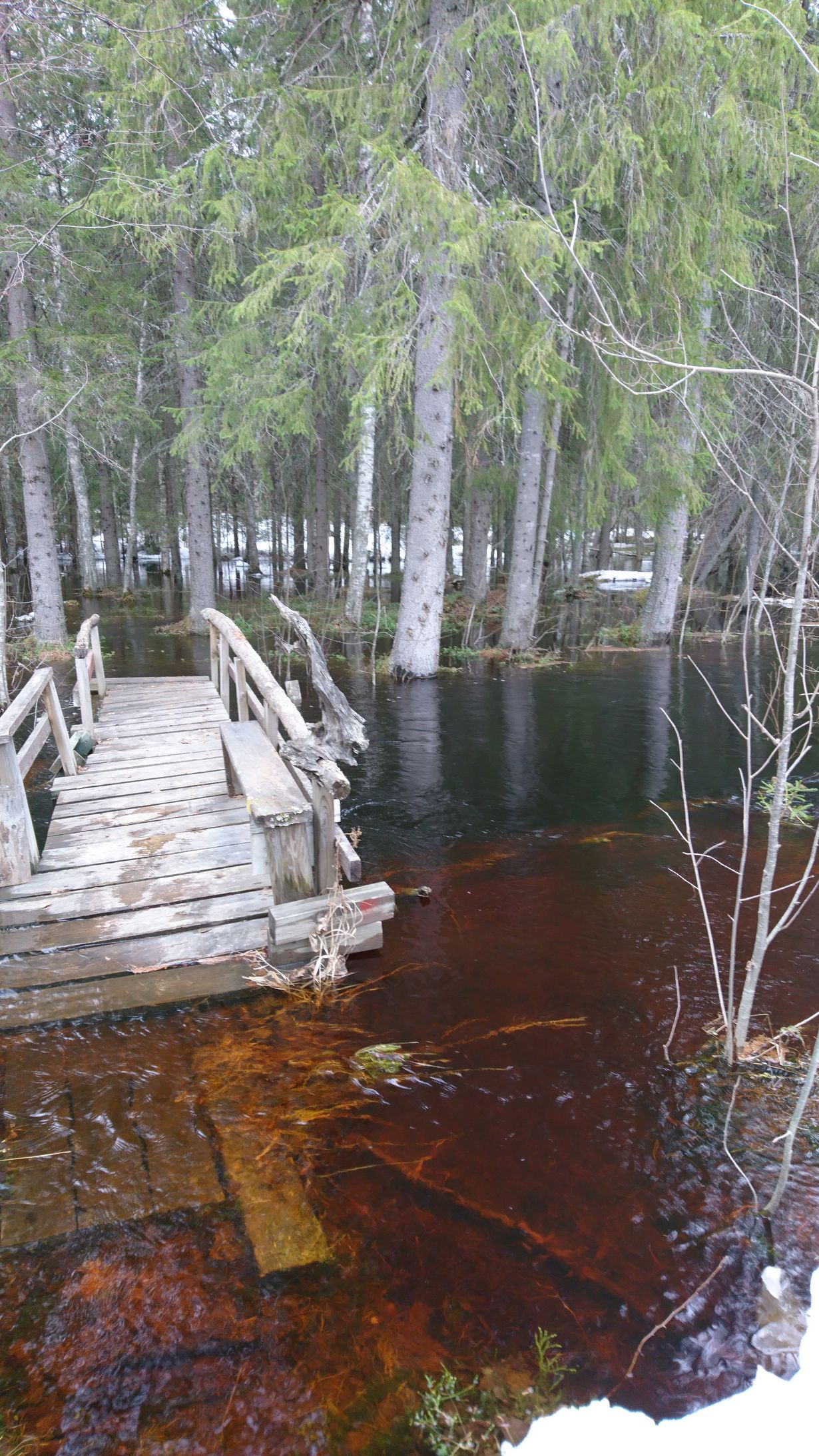 Huhtikuun lopussa mökkeilimme ja mennessä oli yli puoli metriä lunta. Lumet alkoivat sulaa nopeasti ja purosta tuli joki jättäen laiturin saarroksiin.