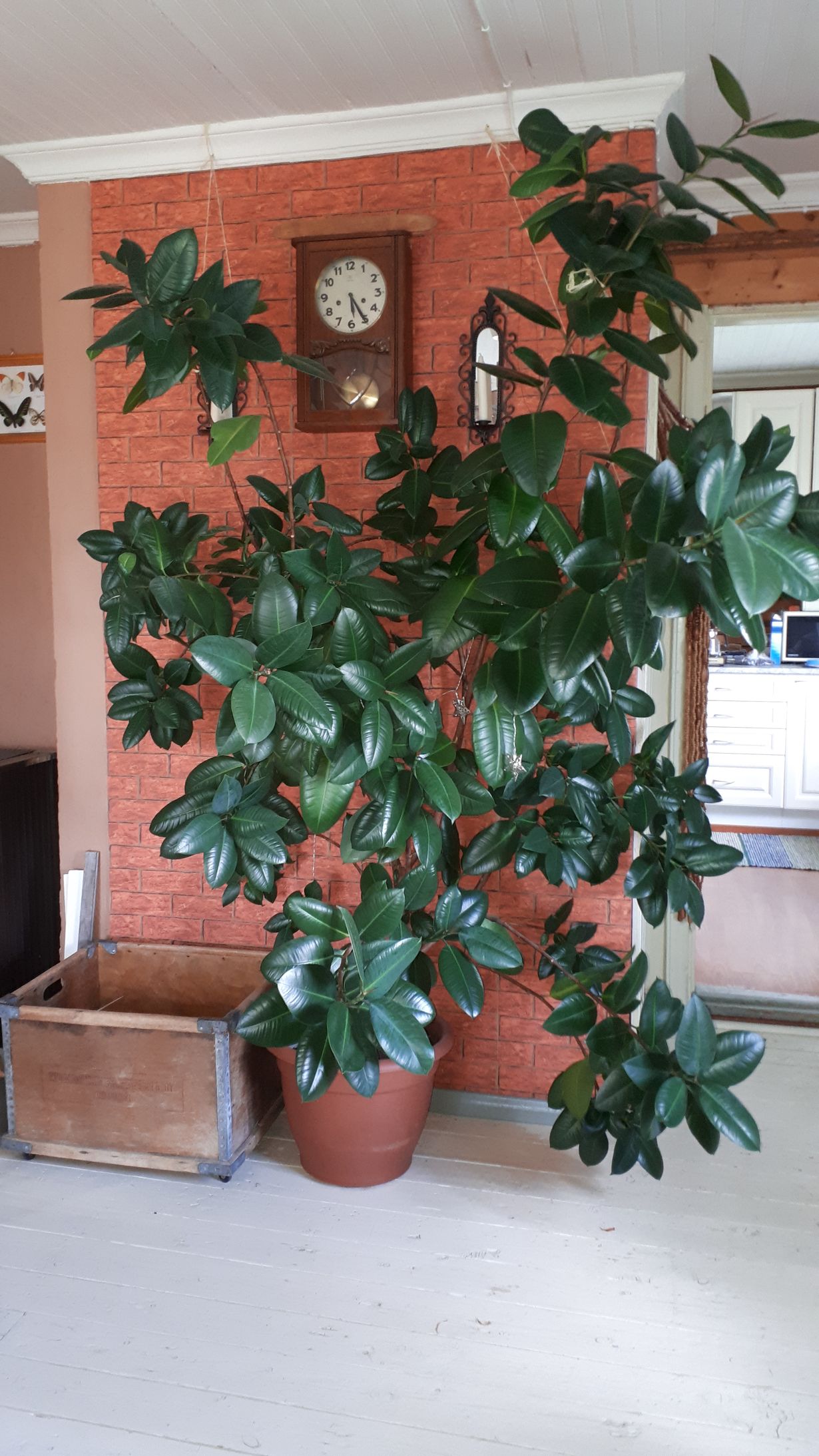 Fiikus on saatu keväällä 2006 mökillemme tupaantuliaislahjaksi. Se oli yksivartinen n. 40 cm korkea ja siinä oli 9 lehteä.