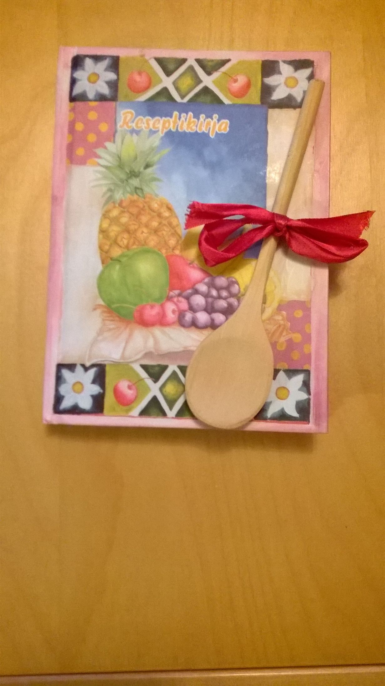 Tämän reseptikirjan sain muutama vuosi sitten silloin 9-vuotiaalta pojanpojaltani joululahjaksi. Kirja on ollut mökillä, jossa siihen on joka kesä kirjoitettu maukkaimmat reseptit. Ovat hyvässä tallessa ja löytyvät kaikki samasta paikasta. Maistelulusikkaa en ole raaskinut käyttää, joten se on ollut vain koristeena.