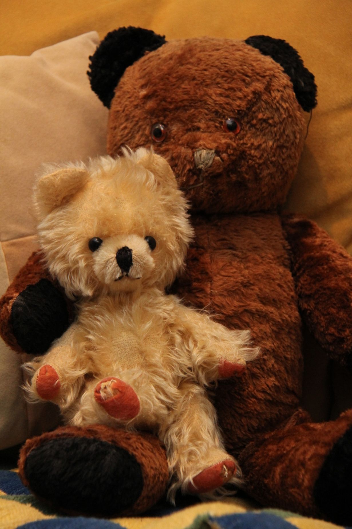 Mökö ja Julle, parhaat kaverit 45 vuoden takaa. Tassut puhki käveltynä ja Jullen keltainen päälaki paljaaksi silitettynä edelleen menossa mukana. Rauhallisempana tyyppinä Mökö on säilynyt vähemmillä vaurioilla. Kotipaikka muuttunut vuosien mittaan Iisalmen Pörsänmäestä Kuopion kautta Tampereelle.