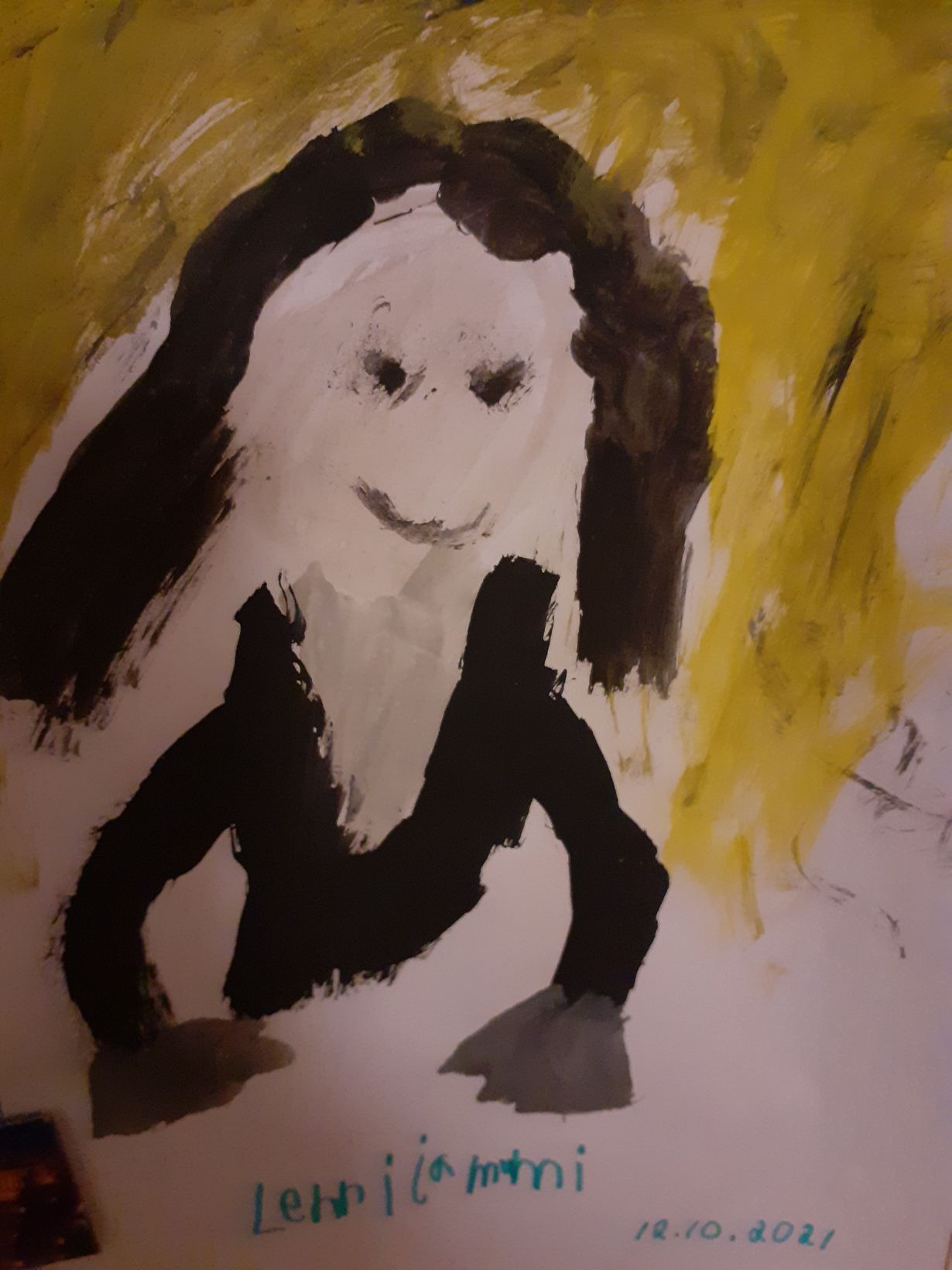 Lapsenlapsi Lenni maalasi kuvan Mona Lisasta 5-vuotiaana, nyt hän on 11-vuotias. Meillä on seinällä Mons Lisan kuva, siitä Lenni otti mallia