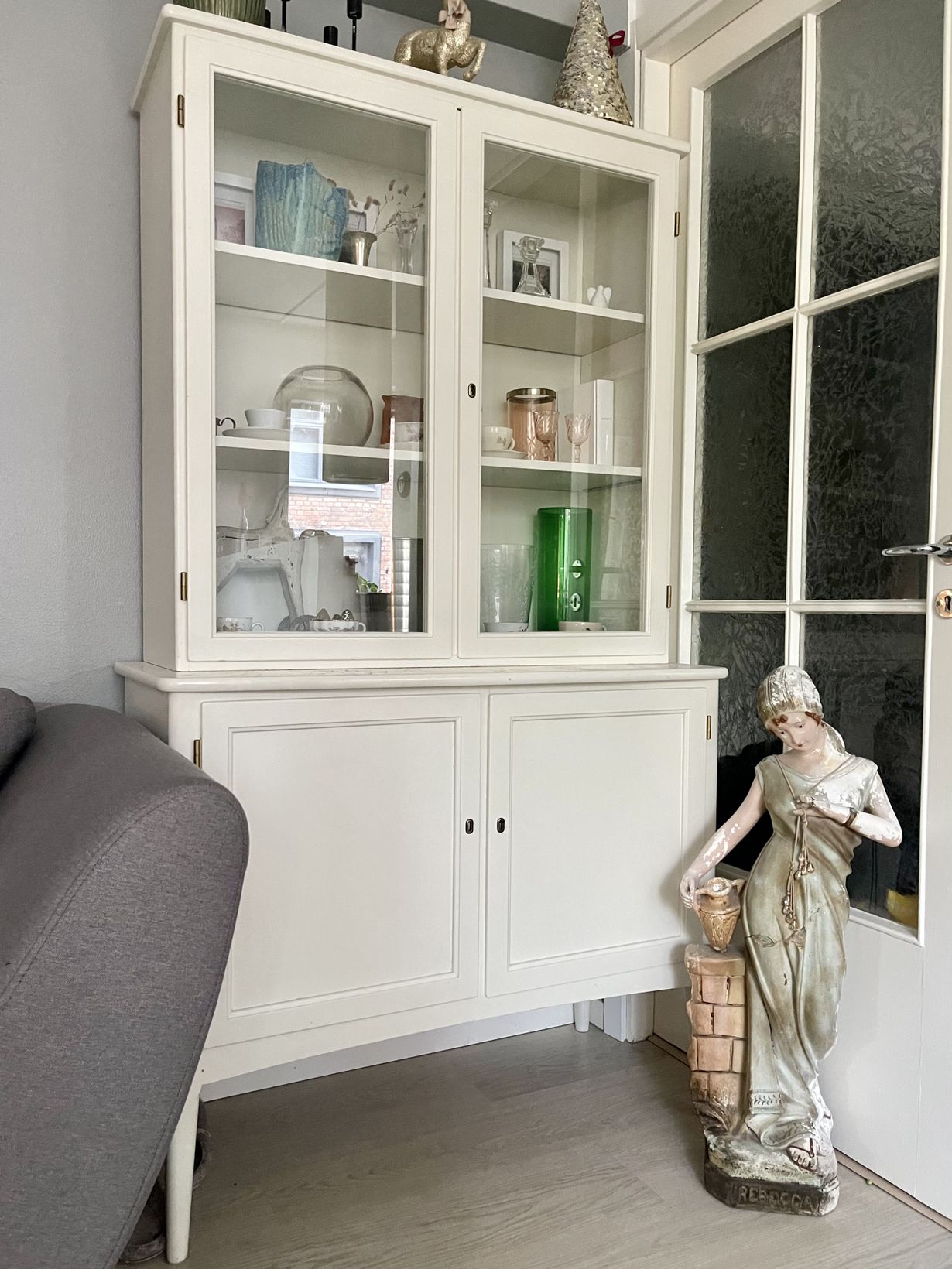 Etsimme pitkään vaaleaa vitriiniä kotiimme, toiveissa oli kierrätetty löytö. Kolusimme kirppiksiä ja lopulta löysimme juuri sellaisen, mitä etsimme. Vitriini oli siisti eikä hinta huimannut päätä, ainoa vika oli, että se oli tuotu kirppikselle ilman avainta. Vanha rouva, joka vitriinin oli omistanut, ei muistanut, minne oli avaimen piilottanut. Teimme varauksen vitriiniin avaimen löytymisen varalta. Noin kuukausi tämän jälkeen poikkesin samalle kirppikselle ja huomasin vitriinin edelleen olevan siellä. Kassajonossa kuulin, kuinka edellä ollut asiakas teki vitriinistä kauppaa ja oli maksua vaille valmis. Huikkasin, että olemme tehneet vitriinistä varauksen ja odotamme edelleen yhteydenottoa, jos avaimet ovat löytyneet. Myyjä ei tiennyt varauksesta mitään, mutta niin vain löytyi meidän varaus kansiosta ja saimme hakea vitriinin samana iltana kotiin. Nyt jo lähemmäs 10 vuotta meillä asunut ja kohta taas muutto edessä, vitriini mukana.