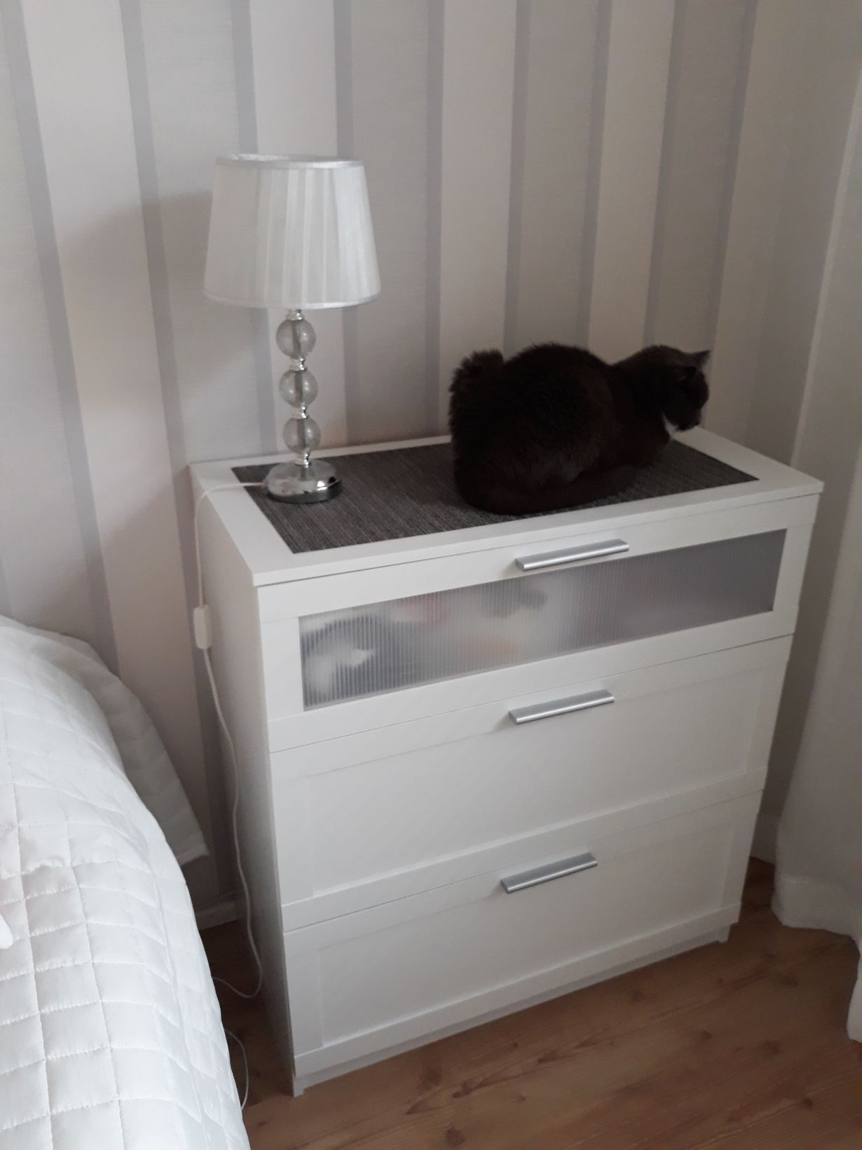 "Yöpöytänä" meillä toimii lipasto, ja lipaston päällä lepäilee usein kisu ? varsinkin näin helteellä se on hänen suosikki paikka.