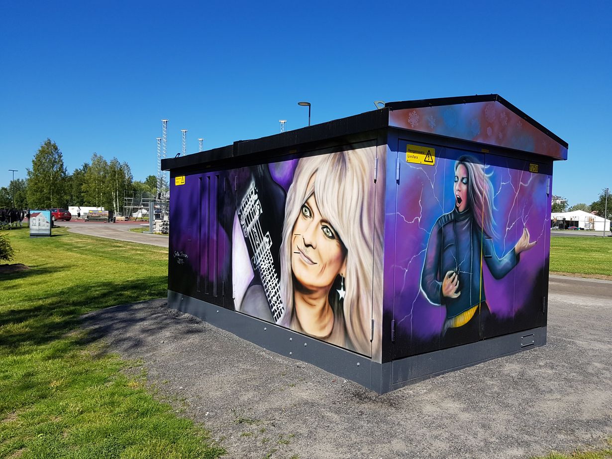 Oulun Kuusisaaressa sijaitseva muuntamokoppi on saanut koristeekseen kuuluisia rokkitähtiä, suosikkini on Michael Monroe