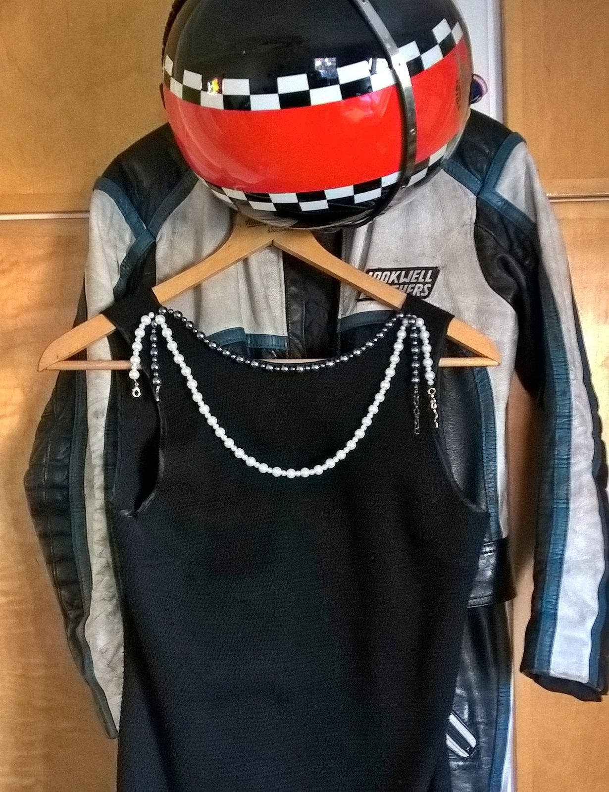 Pikkumusta, rypistymätön, johon on ommeltu 2 helminauhaa. Vain nahkapuku ja kypärä pois, ja bileet jatkuvat vaikka missä. Jos vielä muistaisin ottaa korkkarit reppuun!