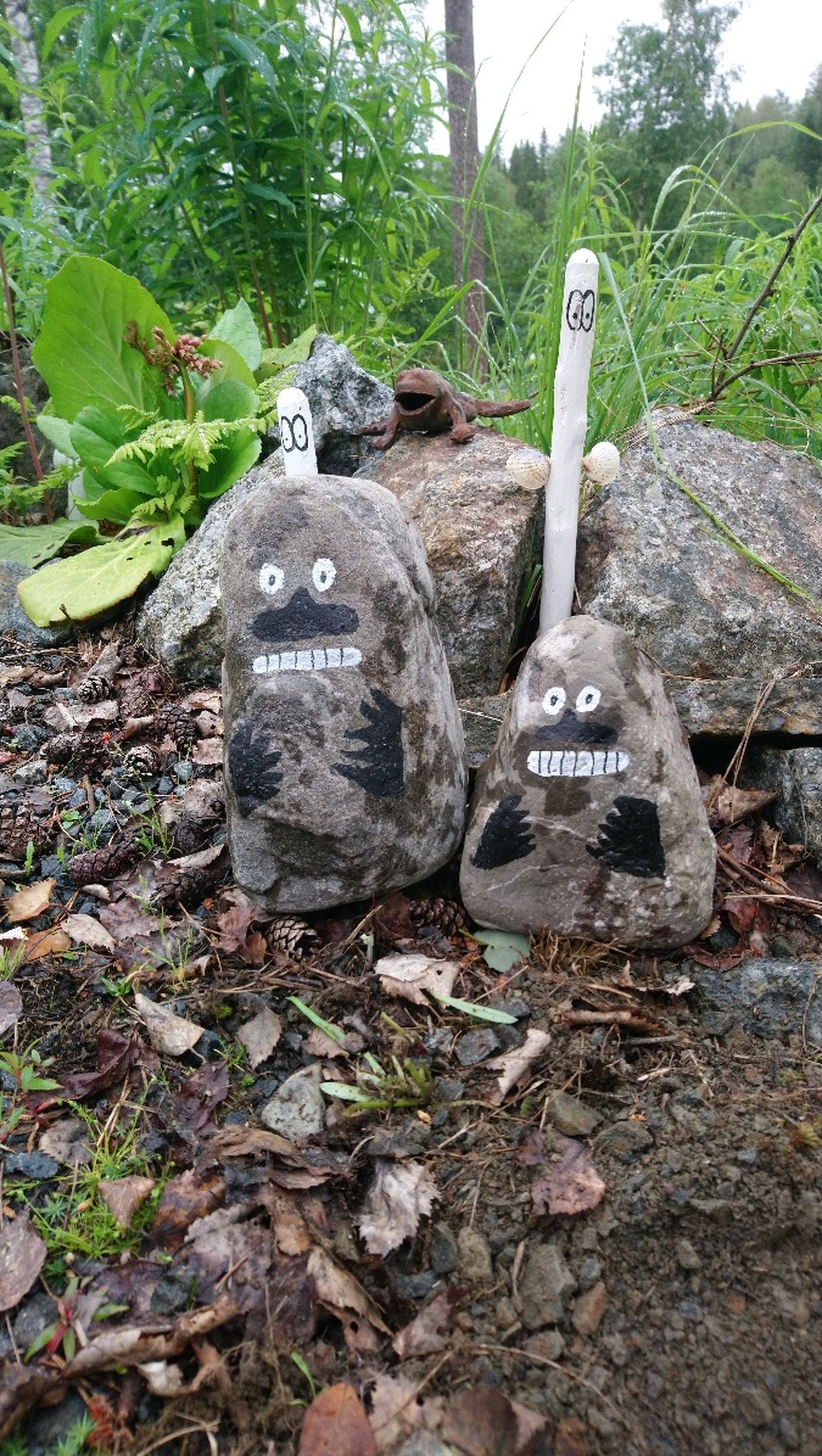 Tälläisen hupsun perheen puutarhaan sopii hienosti mörkö-pariskunta ja hattivatit. Mörkö-pariskunnan saimme hääpäivälahjaksi ja hattivatit on tyttären tekemiä. Parhaita lahjoja on itsetehdyt.