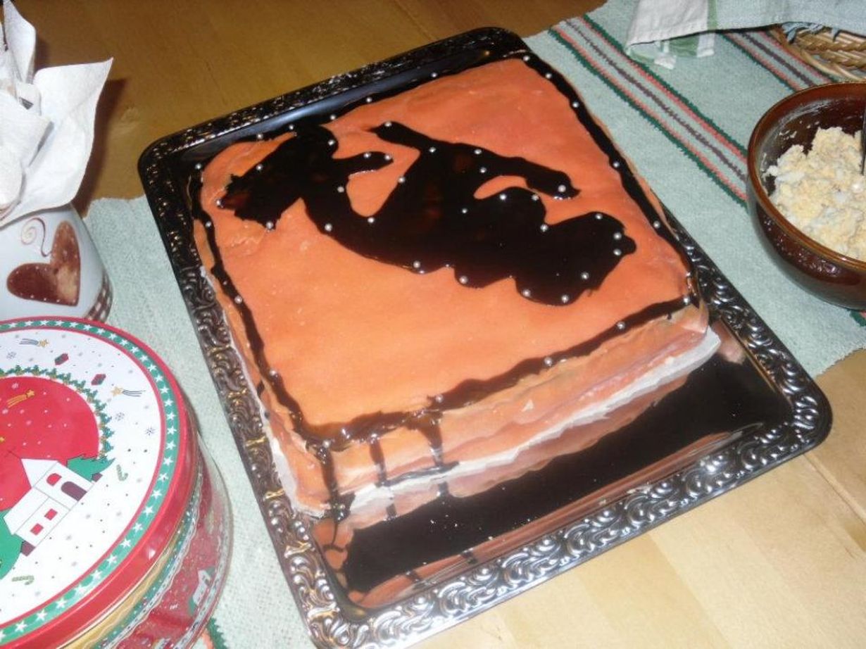 Tämä kakku on KTM-moottoripyörällä motocrossia ajavan veljeni synttärikakku, joka on koristeltu teemaan kuuluvasti öljyn näköisellä lakritsikastikkeella ja oranssilla marsipaanilla.