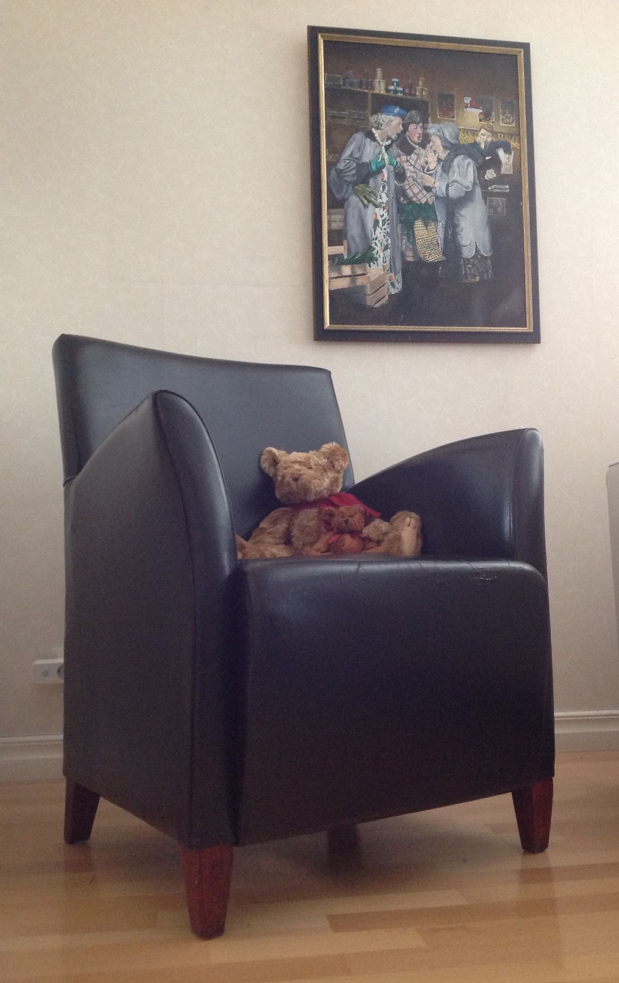Tähän nurkkaan piti löytää tuoli, jotta isän maalaaman taulun rouvien seurassa voi istua ja mietiskellä. Kirppikseltä löytyi pieni ja siro nahkatuoli, hiukan kulunut niin kuin myyjänsäkin; herrasmies joka oli pyörällä kaatunut ja tarvitsi rahaa hammaslääkäriin..