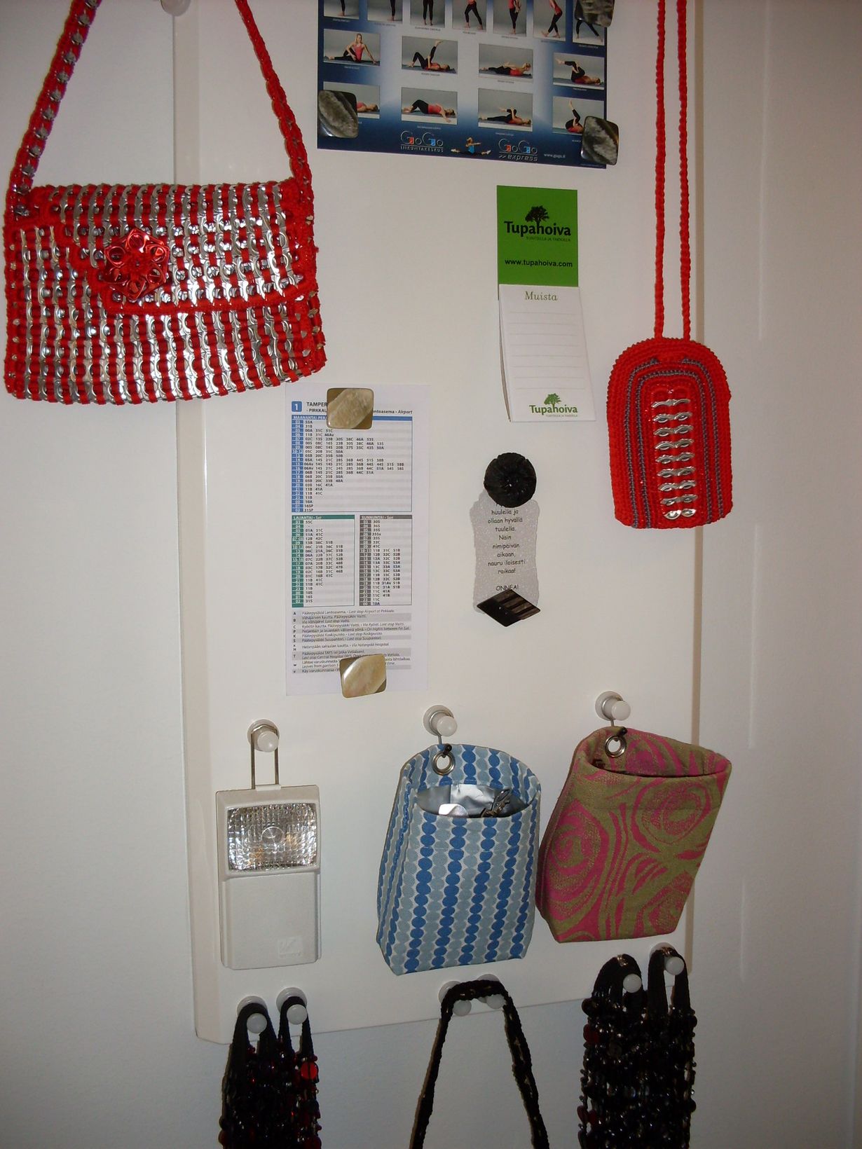 Sähkökaappi on eteisessä näkyvällä paikalla, joten hyödynsin sen metalliovea. Vanhoista napeista tein kiinnitysmangneetteja ja kaupasta löysin koukkuja, joissa on mangneetit valmiina.