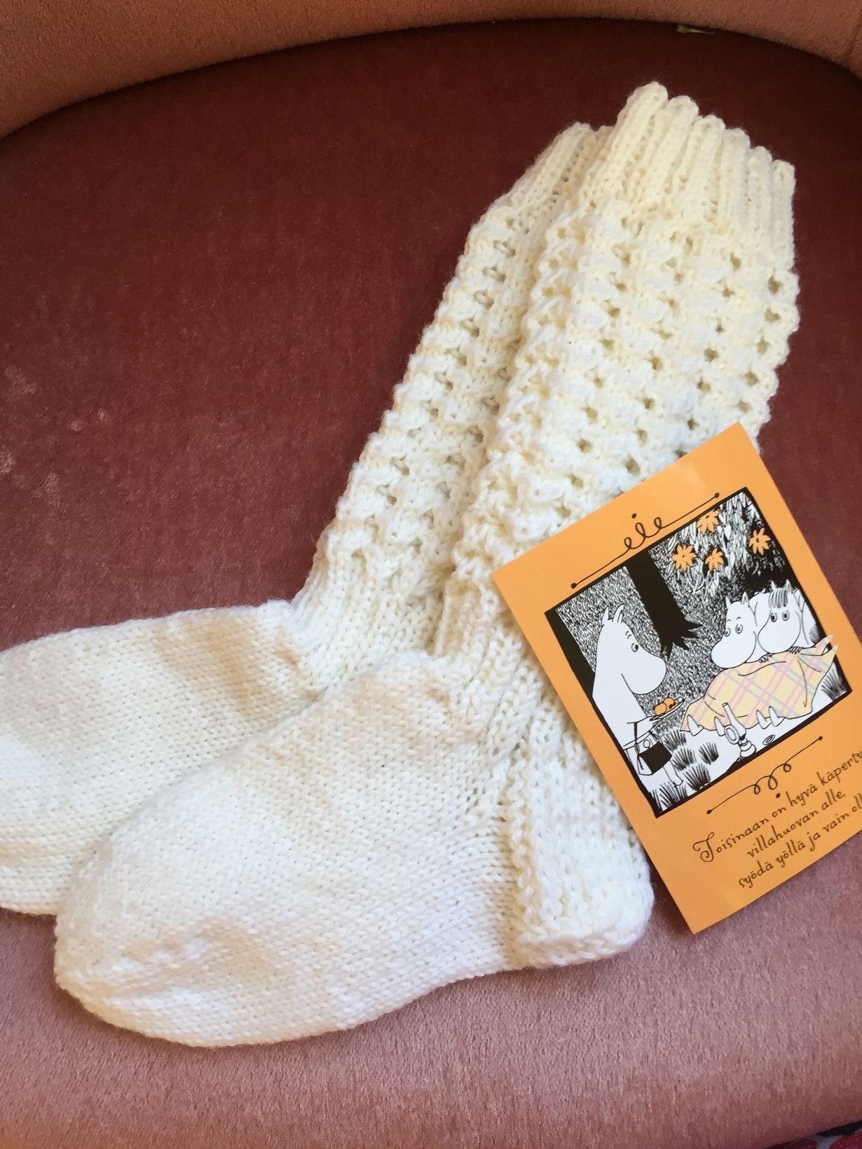 Sain nämä kauniit sukat eläkkeelle jäädessäni. Muistan näitä käyttäessäni sukkien tekijää ja hyvää yhteistyötä hänen kanssaan.