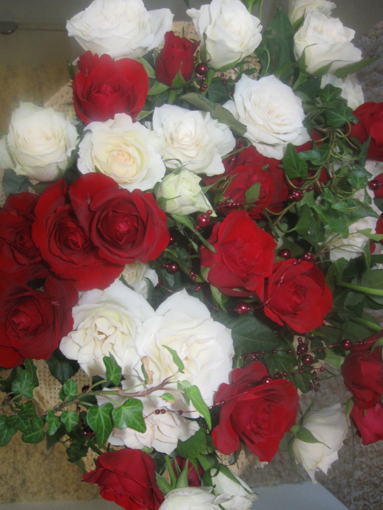 Kuvassa olevia kukkia oli hääjuhlassamme pöytäkoristeina. Häistä seuraavana päivänä asettelin kukat samaan maljakkoon ilahduttaaksemme meitä ja tuoden muistot mieleen päivästä, jolloin sanoimme "Tahdon".