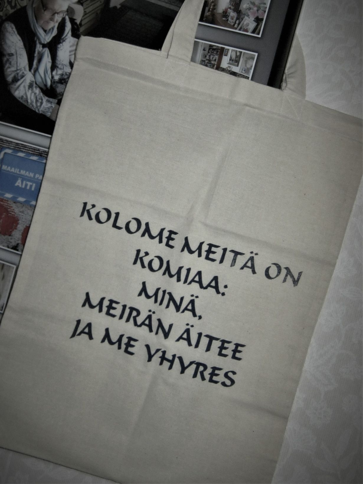 Sikäli outo matkamuisto, kun se ei kelpaa tarkoitukseensa: en vaan malta käyttää sitä! Kangaskassi kertoo vuosien takaisesta matkasta Kauhajoen ruokamessuille jo edesmenneen rakkaan äitini kanssa..