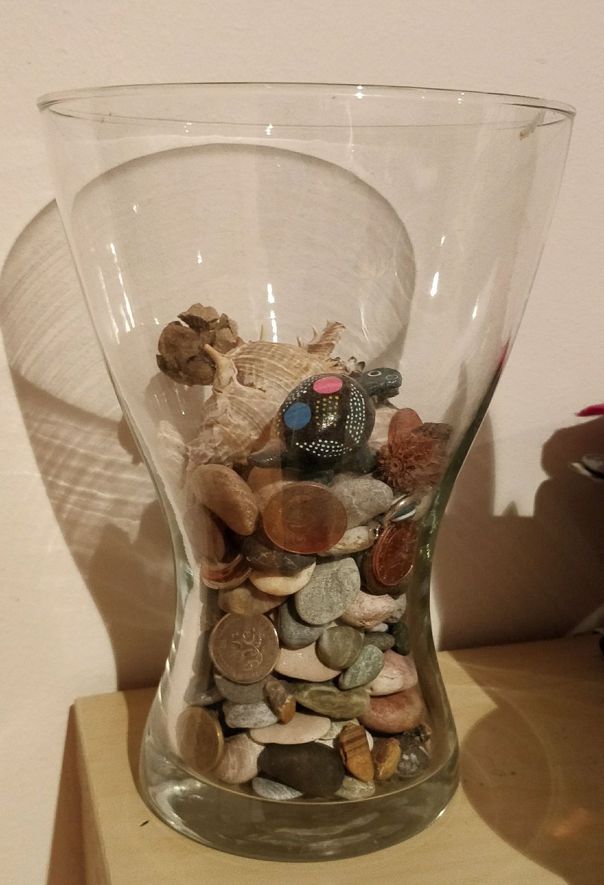 Lasten kanssa keräämme jokaiselta matkalta rantakiviä ja simpukoita kuvan maljakkoon. On siellä muutama ylijäänyt kolikkokin, sekä lasten löytämiä hienoja käpyjä. Edustettuna ovat tähän mennessä, pohjalta ylöspäin: Bulgaria, Turkki, Kroatia, Kypros ja Teneriffa.