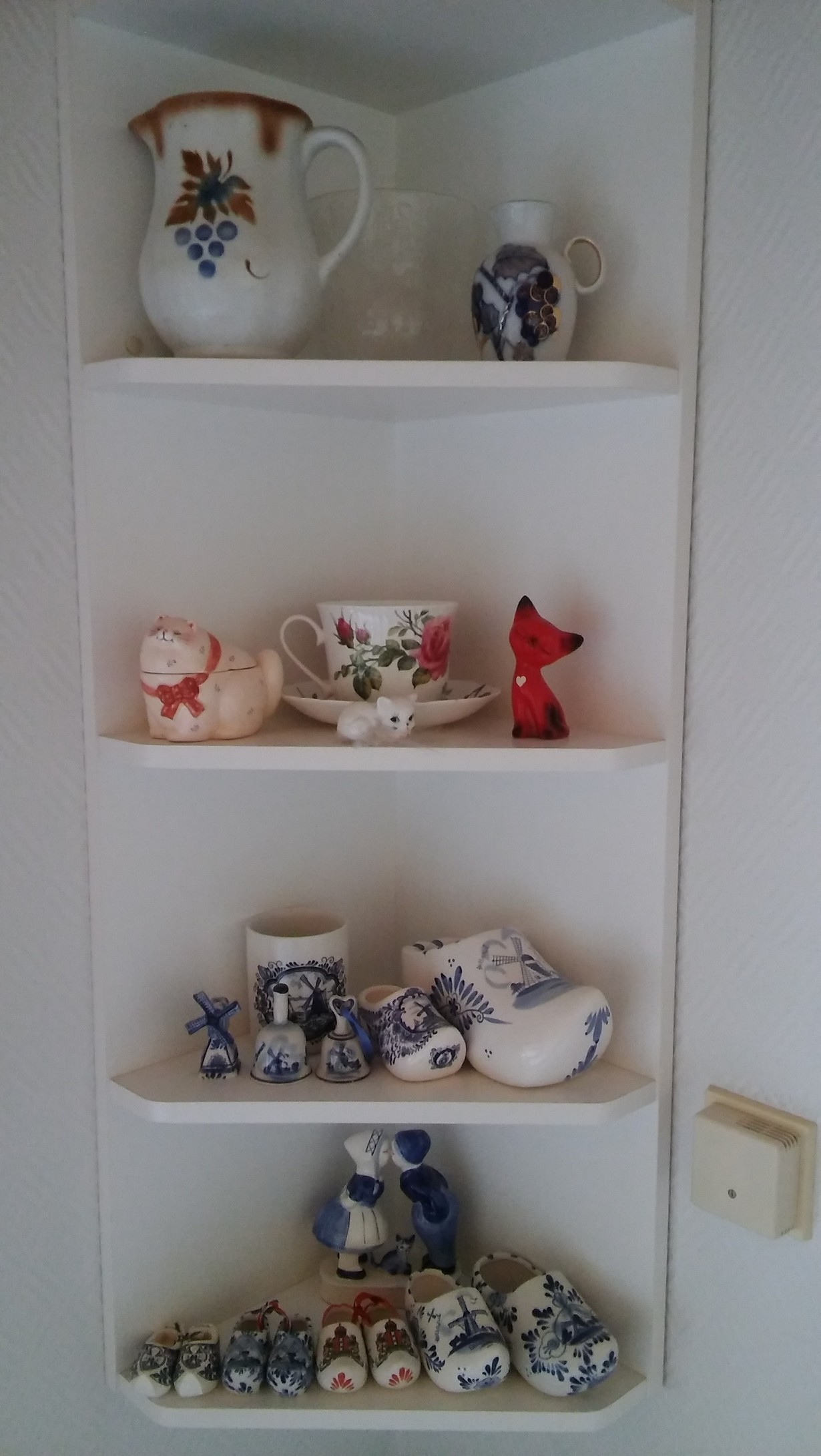 Keittiön pienen kulmahyllykön sisältö koostuu muistoesineistä sekä Hollanti-aiheisista keräilytavaroista, joista suurin osa kirpputorilöytöjä. Mummolan vanha maitokannu on kunniapaikalla ylimmäisenä, samoin n. 30 vuotta sitten lasinkeräyssäiliöstä löytämäni Fauna-maljakko. Rakkain esine on punainen posliinikissa, jonka sain lahjaksi kirjeenvaihtoystävältältäni Saksasta 70-luvun lopulla. Ikävä kyllä kissan pari putosi aikoinaan lattialle ja särkyi. Ystävyys on kuitenkin kestänyt jo yli 40 vuotta.