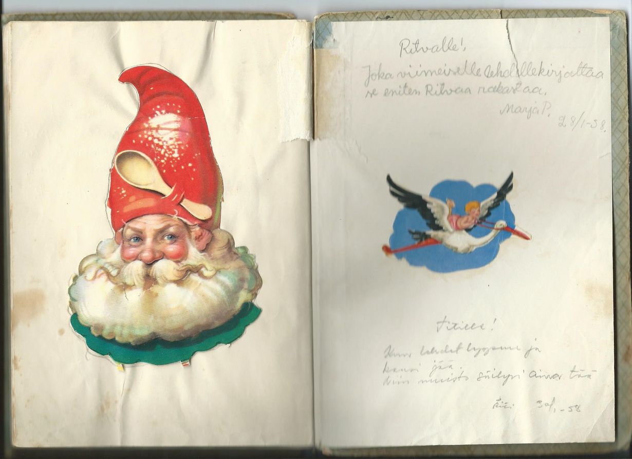 Kiiltokuvavihkosta aukeama, Muistovärssyt kirjoittanut ystävä Marja 28.1.1958 ja äiti 30.1.1958, olen silloin ollut itse 10 vuotta vanha. Vihko on edelleen tallessa.