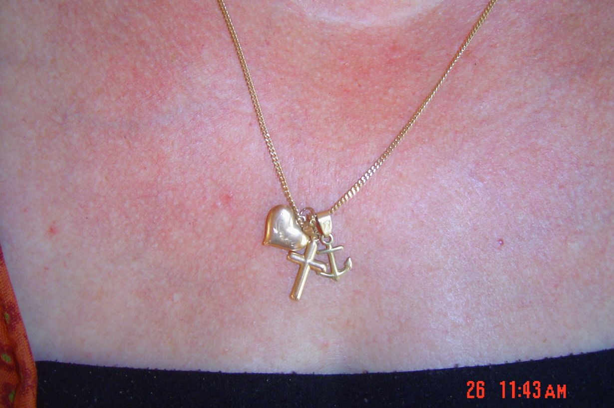 Koruun olen saanut osat rakkailta läheisiltä ajan kuluessa: risti oli poikani, sydämen sain 40-vuotislahjaksi perheeltäni ja ankkuri on muisto Kreetan matkalta. Koru on aina kaulassani.